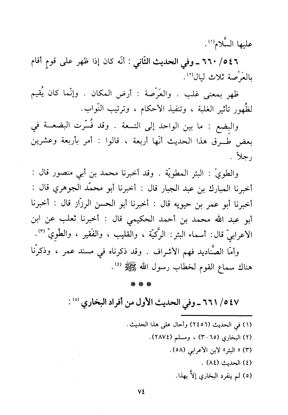 546 - / 660 وَفِي الحَدِيث الثَّانِي: أَنه كَانَ إِذا ظهر على قوم أَقَامَ بالعرصة ثَلَاث لَيَال. [15] ظهر بِمَعْنى غلب. والعرصة: أَرض الْمَكَان. وَإِنَّمَا كَانَ يُقيم لظُهُور تَأْثِير الْغَلَبَة، وتنفيذ الْأَحْكَام، وترتيب النواب. [15] والبضع: مَا بَين الْوَاحِد إِلَى التِّسْعَة. وَقد فسرت الْبضْعَة فِي بعض طرق هَذَا الحَدِيث أَنَّهَا أَرْبَعَة، قَالُوا: أَمر بأَرْبعَة وَعشْرين رجلا. [15] والطوي: الْبِئْر المطوية. وَقد أخبرنَا مُحَمَّد بن أبي مَنْصُور قَالَ: أخبرنَا الْمُبَارك بن عبد الْجَبَّار قَالَ: أخبرنَا أَبُو مُحَمَّد الْجَوْهَرِي قَالَ: أخبرنَا أَبُو عمر بن حيويه قَالَ: أخبرنَا أَبُو الْحسن الرزاز قَالَ: أخبرنَا أَبُو عبد الله مُحَمَّد بن أَحْمد الحكيمي قَالَ: أخبرنَا ثَعْلَب عَن ابْن الْأَعرَابِي قَالَ: أَسمَاء الْبِئْر: الرَّكية، والقليب، وَالْفَقِير، والطوي. [15] وَأما الصناديد فهم الْأَشْرَاف. وَقد ذَكرْنَاهُ فِي مُسْند عمر، وَذكرنَا هُنَاكَ سَماع الْقَوْم لخطاب رَسُول الله صلى الله عَلَيْهِ وَسلم.
