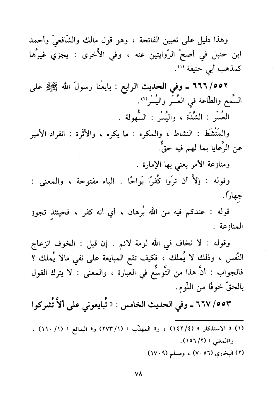 وَهَذَا دَلِيل على تعْيين الْفَاتِحَة، وَهُوَ قَول مَالك وَالشَّافِعِيّ وَأحمد ابْن حَنْبَل فِي أصح الرِّوَايَتَيْنِ عَنهُ، وَفِي الْأُخْرَى: يَجْزِي غَيرهَا كمذهب أبي حنيفَة. 3552 / 666 - وَفِي الحَدِيث الرَّابِع: بَايعنَا رَسُول الله صلى الله عَلَيْهِ وَسلم على السّمع وَالطَّاعَة فِي الْعسر واليسر. [15] الْعسر: الشدَّة، واليسر: السهولة. [15] والمنشط: النشاط، وَالْمكْره: مَا يكره، والأثرة: انْفِرَاد الْأَمِير عَن الرعايا بِمَا لَهُم فِيهِ حق. [15] ومنازعة الْأَمر يَعْنِي بهَا الْإِمَارَة. [15] وَقَوله: إِلَّا أَن تروا كفرا بواحا. الْبَاء مَفْتُوحَة، وَالْمعْنَى: جهارا. [15] قَوْله: عنْدكُمْ فِيهِ من الله برهَان، أَي أَنه كفر، فَحِينَئِذٍ تجوز الْمُنَازعَة. [15] وَقَوله: لَا نَخَاف فِي الله لومة لائم. إِن قيل: الْخَوْف انزعاج النَّفس، وَذَلِكَ لَا يملك، فَكيف تقع الْمُبَايعَة على نفي مَالا يملك؟ فَالْجَوَاب: أَن هَذَا من التَّوَسُّع فِي الْعبارَة، وَالْمعْنَى: لَا يتْرك القَوْل بِالْحَقِّ خوفًا من اللوم.