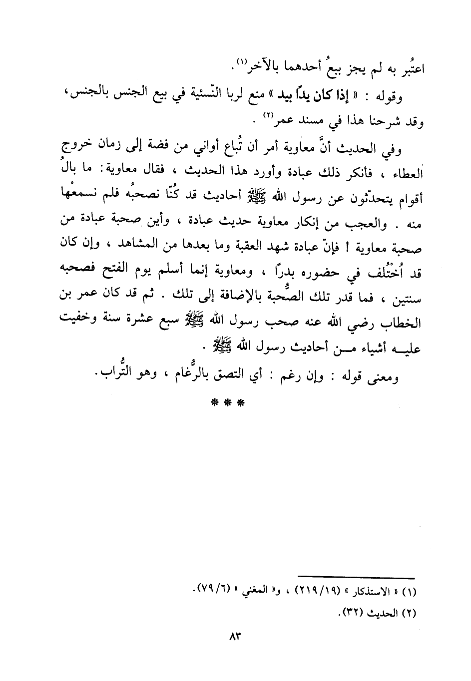اعْتبر بِهِ لم يجز بيع أَحدهمَا بِالْآخرِ. [15] وَقَوله: " إِذا كَانَ يدا بيد " منع لربا النسئية فِي الْجِنْس بِالْجِنْسِ، وَقد شرحنا فِي مُسْند عمر. [15] وَفِي الحَدِيث أَن مُعَاوِيَة أَمر أَن تبَاع أواني من فضَّة إِلَى زمَان خُرُوج الْعَطاء، فَأنْكر ذَلِك عبَادَة وَأورد هَذَا الحَدِيث، فَقَالَ مُعَاوِيَة: مَا بَال أَقوام يتحدثون عَن رَسُول الله صلى الله عَلَيْهِ وَسلم أَحَادِيث قد كُنَّا نصحبه فَلم نسمعها مِنْهُ. وَالْعجب من إِنْكَار مُعَاوِيَة حَدِيث عبَادَة، وَأَيْنَ صُحْبَة عبَادَة من صُحْبَة مُعَاوِيَة! فَإِن عبَادَة شهد الْعقبَة وَمَا بعْدهَا من الْمشَاهد، وَإِن كَانَ قد اخْتلف فِي حُضُوره بَدْرًا، وَمُعَاوِيَة إِنَّمَا أسلم يَوْم الْفَتْح فصحبه سنتَيْن، فَمَا قدر تِلْكَ الصُّحْبَة بِالْإِضَافَة إِلَى تِلْكَ. ثمَّ قد كَانَ عمر بن الْخطاب رَضِي الله عَنهُ صحب رَسُول الله صلى الله عَلَيْهِ وَسلم سبع عشرَة سنة وخفيت عَلَيْهِ أَشْيَاء من أَحَادِيث رَسُول الله صلى الله عَلَيْهِ وَسلم. [15] وَمعنى قَوْله: وَإِن رغم: أَي الْتَصق بالرغام، وَهُوَ التُّرَاب.