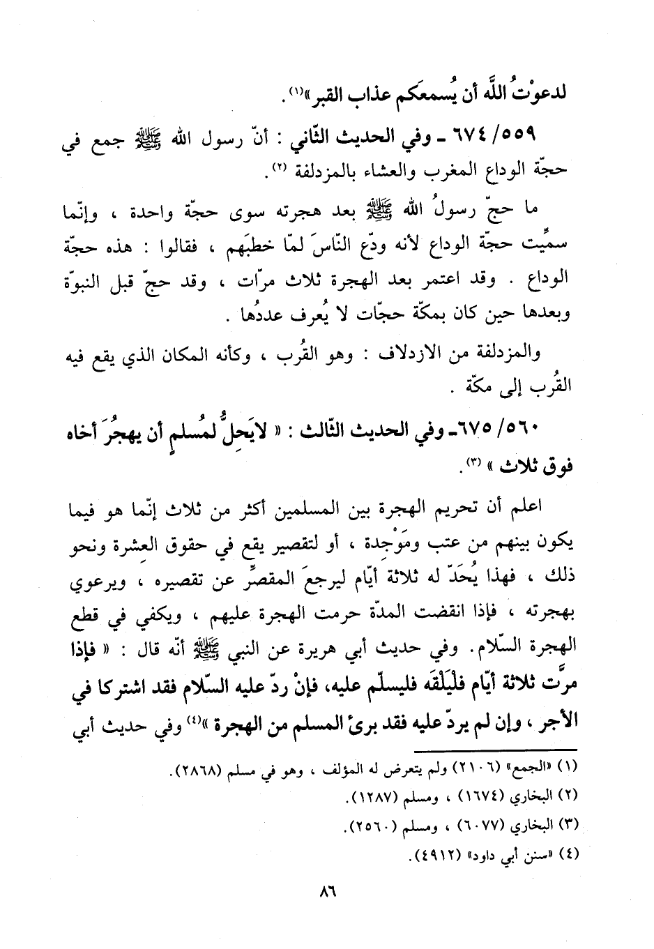 559 - / 674 - وَفِي الحَدِيث الثَّانِي: أَن رَسُول الله صلى الله عَلَيْهِ وَسلم جمع فِي حجَّة الْوَدَاع الْمغرب وَالْعشَاء بِالْمُزْدَلِفَةِ. [15] مَا حج رَسُول الله صلى الله عَلَيْهِ وَسلم بعد هجرته سوى حجَّة وَاحِدَة، وَإِنَّمَا سميت حجَّة الْوَدَاع لِأَنَّهُ ودع النَّاس لما خطبهم، فَقَالُوا: هَذِه حجَّة الْوَدَاع، وَقد اعْتَمر بعد الْهِجْرَة ثَلَاث مَرَّات، وَقد حج قبل النُّبُوَّة وَبعدهَا حِين كَانَ بِمَكَّة حجات لَا يعرف عَددهَا. [15] والمزدلفة من الازدلاف، وَهُوَ الْقرب، وَكَأَنَّهُ الْمَكَان الَّذِي يَقع فِيهِ الْقرب إِلَى مَكَّة.