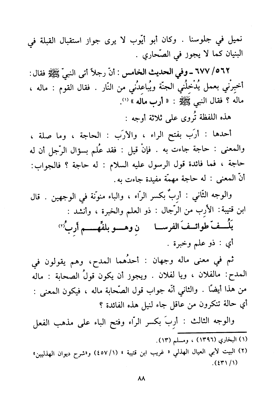 562 - / 677 وَفِي الحَدِيث الْخَامِس: أَن رجلا أَتَى النَّبِي صلى الله عَلَيْهِ وَسلم فَقَالَ: أَخْبرنِي بِعَمَل يدخلني الْجنَّة وَيُبَاعِدنِي من النَّار. فَقَالَ الْقَوْم: مَاله، مَاله؟ فَقَالَ النَّبِي صلى الله عَلَيْهِ وَسلم: " أرب مَاله ". [15] هَذِه اللَّفْظَة تروى على ثَلَاثَة أوجه: [15] أَحدهَا: أرب بِفَتْح الرَّاء، والأرب: الْحَاجة، وَمَا صلَة، وَالْمعْنَى: حَاجَة جَاءَت بِهِ. فَإِن قيل: فقد علم بسؤال الرجل أَن لَهُ حَاجَة، فَمَا فَائِدَة قَول الرَّسُول عَلَيْهِ السَّلَام: لَهُ حَاجَة؟ فَالْجَوَاب: أَن الْمَعْنى: لَهُ حَاجَة مهمة مفيدة جَاءَت بِهِ. [15] وَالْوَجْه الثَّانِي: أرب بِكَسْر الرَّاء، وَالْبَاء منونة فِي الْوَجْهَيْنِ. قَالَ ابْن قُتَيْبَة: الأرب من الرِّجَال: ذُو الْعلم والخبرة، وَأنْشد: