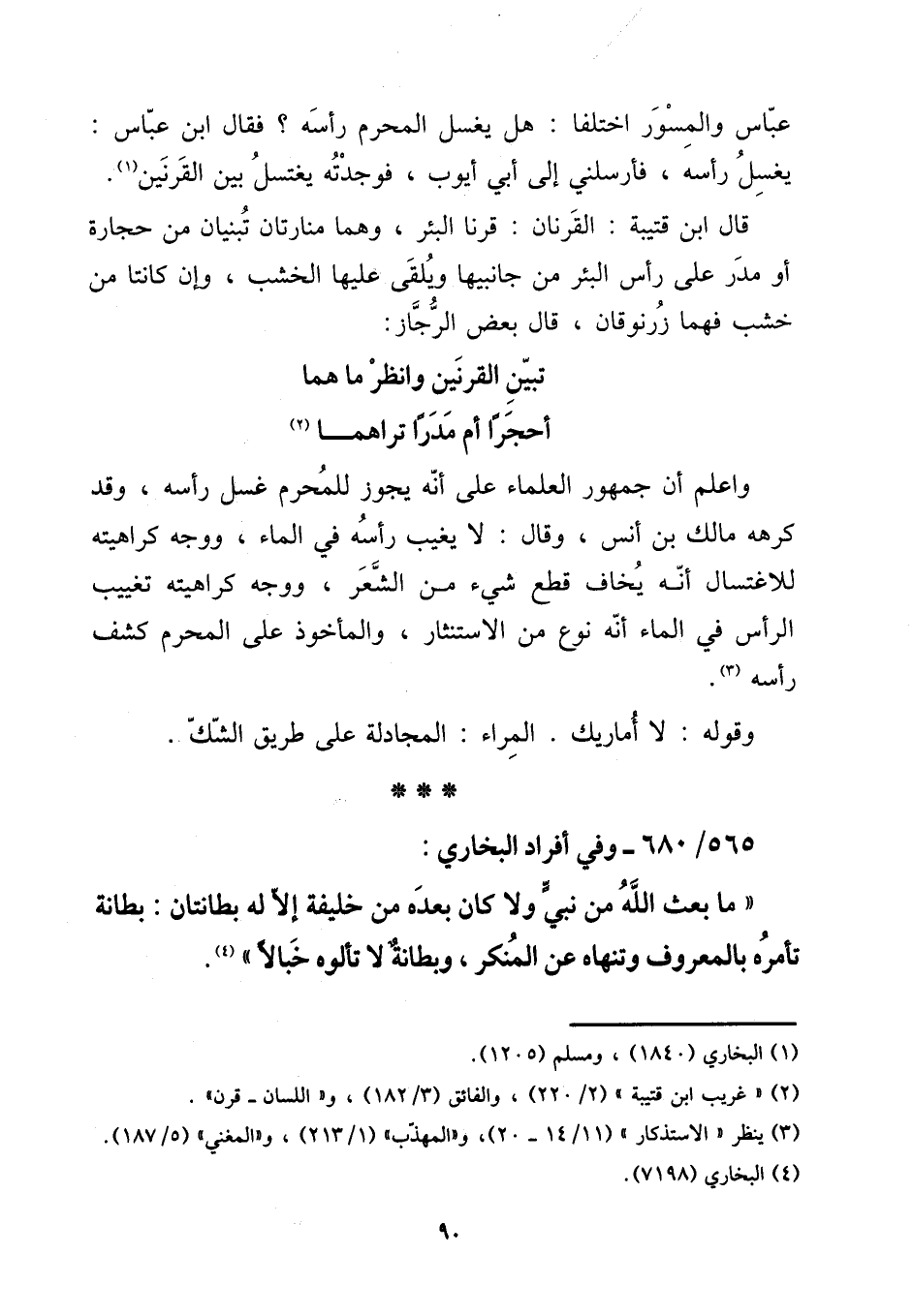 عَبَّاس والمسور اخْتلفَا: هَل يغسل الْمحرم رَأسه؟ فَقَالَ ابْن عَبَّاس: يغسل رَأسه، فأرسلني إِلَى أبي أَيُّوب، فَوَجَدته يغْتَسل بَين القرنين. [15] قَالَ ابْن قُتَيْبَة: القرنان: قرنا الْبِئْر، وهما منارتان تبنيان من حِجَارَة أَو مدر على رَأس الْبِئْر من جانبيها ويلقى عَلَيْهَا الْخشب، وَإِن كَانَتَا من خشب فهما زرنوقان، قَالَ بعض الرجاز: