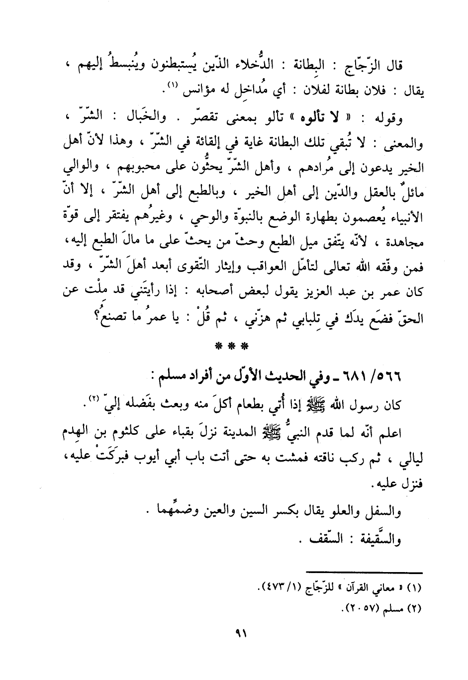 566 - / 681 - وَفِي الحَدِيث الأول (أَفْرَاد مُسلم: كَانَ رَسُول الله صلى الله عَلَيْهِ وَسلم إِذا أُتِي بِطَعَام أكل مِنْهُ وَبعث بفضله إِلَيّ. [15] اعْلَم أَنه لما قدم النَّبِي صلى الله عَلَيْهِ وَسلم الْمَدِينَة نزل بقباء على كُلْثُوم بن الْهدم ليَالِي، ثمَّ ركب نَاقَته فمشت بِهِ حَتَّى أَتَت بَاب أبي أَيُّوب فبركت عَلَيْهِ، فَنزل عَلَيْهِ. والسفل والعلو يُقَال بِكَسْر السِّين وَالْعين وضمهما. والسقيفة: السّقف.
