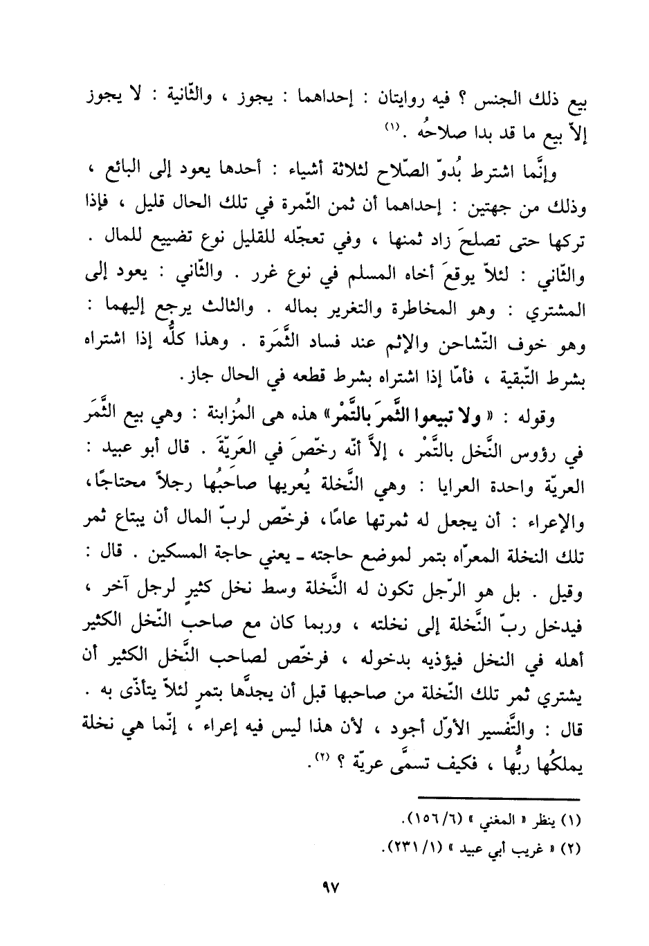 بيع ذَلِك الْجِنْس؟ فِيهِ رِوَايَتَانِ: إِحْدَاهمَا: يجوز، وَالثَّانيَِة: لَا يجوز إِلَّا بيع مَا قد بدا صَلَاحه. [15] وَإِنَّمَا اشْترط بَدو الصّلاح لثَلَاثَة أَشْيَاء: أَحدهَا يعود إِلَى البَائِع، وَذَلِكَ من جِهَتَيْنِ: أحداهما أَن ثمن الثَّمَرَة فِي تِلْكَ الْحَال قَلِيل، فَإِذا تَركهَا حَتَّى تصلح زَاد ثمنهَا، وَفِي تعجله للقليل نوع تَضْييع لِلْمَالِ. وَالثَّانِي: لِئَلَّا يُوقع أَخَاهُ الْمُسلم فِي نوع غرر. وَالثَّانِي: يعود إِلَى المُشْتَرِي: وَهُوَ المخاطرة والتغرير بِمَالِه. وَالثَّالِث يرجع إِلَيْهِمَا: وَهُوَ خوف التشاحن وَالْإِثْم عِنْد فَسَاد الثَّمَرَة. وَهَذَا كُله إِذا اشْتَرَاهُ بِشَرْط التبقية، فَأَما إِذا اشْتَرَاهُ بِشَرْط قطعه فِي الْحَال جَازَ. وَقَوله: " وَلَا تَبِيعُوا الثَّمر بِالتَّمْرِ " هَذِه هِيَ الْمُزَابَنَة: وَهِي بيع الثَّمر فِي رُؤُوس النّخل بِالتَّمْرِ، إِلَّا أَنه رخص فِي الْعرية. قَالَ أَبُو عبيد: الْعرية وَاحِدَة الْعَرَايَا: وَهِي النَّخْلَة يعريها صَاحبهَا رجلا مُحْتَاجا، والإعراء: أَن يَجْعَل لَهُ ثَمَرَتهَا عَاما، فَرخص لرب المَال أَن يبْتَاع ثَمَر تِلْكَ النَّخْلَة المعراة بِتَمْر لموْضِع حَاجته - يَعْنِي حَاجَة الْمِسْكِين. قَالَ: وَقيل. بل هُوَ الرجل تكون لَهُ النَّخْلَة وسط نخل كثير لرجل آخر، فَيدْخل رب النَّخْلَة إِلَى نخلته، وَرُبمَا كَانَ مَعَ صَاحب النّخل الْكثير أَهله فِي النّخل فيؤذيه بِدُخُولِهِ، فَرخص لصَاحب النّخل الْكثير أَن يَشْتَرِي ثَمَر تِلْكَ النَّخْلَة من صَاحبهَا قبل أَن يجدهَا بِتَمْر لِئَلَّا يتَأَذَّى بِهِ. قَالَ: وَالتَّفْسِير الأول أَجود، لِأَن هَذَا لَيْسَ فِيهِ إعراء، إِنَّمَا هِيَ نَخْلَة يملكهَا رَبهَا، فَكيف تسمى عرية؟
