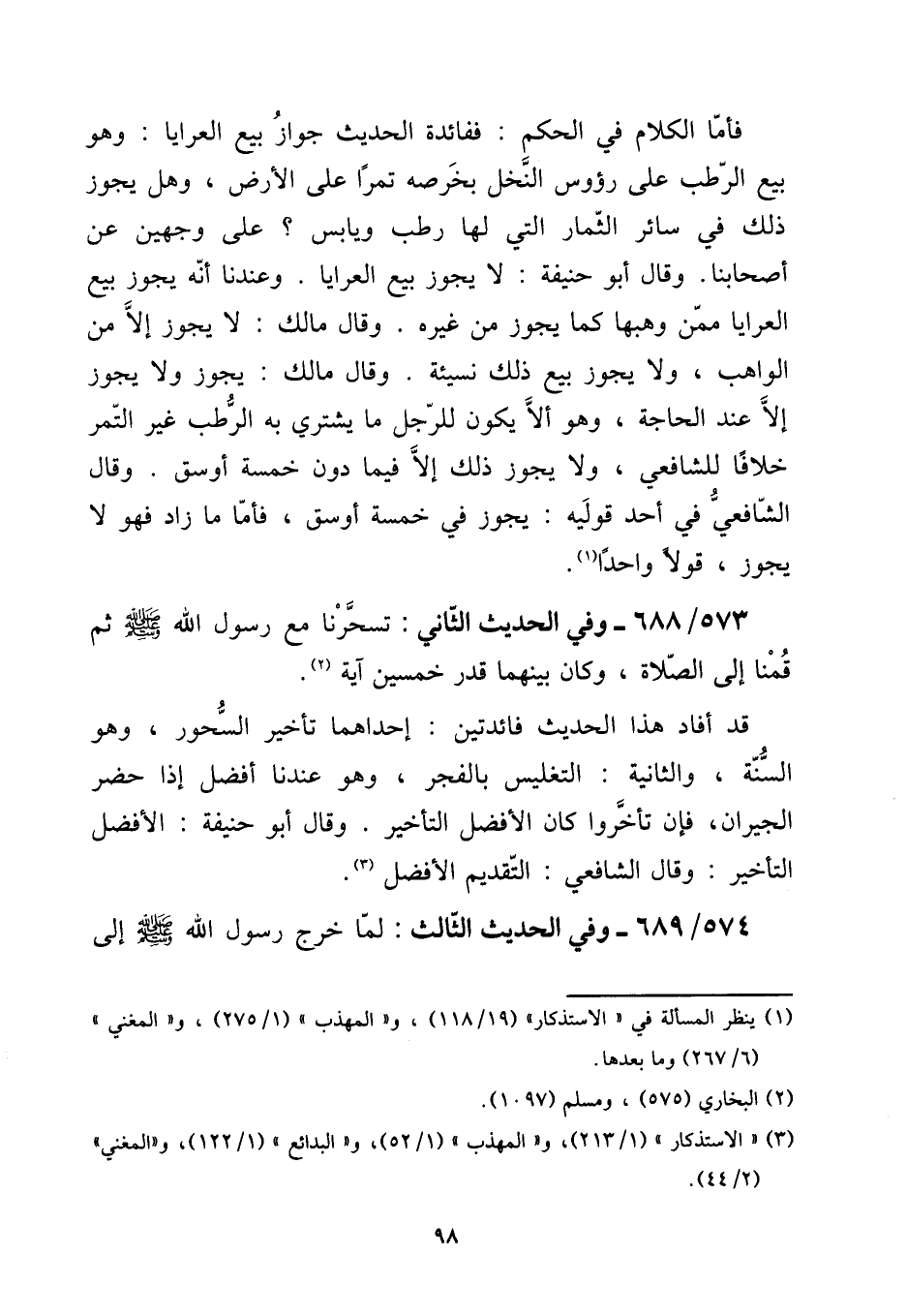 [15] فَأَما الْكَلَام فِي الحكم: ففائدة الحَدِيث جَوَاز بيع الْعَرَايَا: وَهُوَ بيع الرطب على رُؤُوس النّخل بخرصه تَمرا على الأَرْض، وَهل يجوز ذَلِك فِي سَائِر الثِّمَار الَّتِي لَهَا رطب ويابس؟ على وَجْهَيْن عَن أَصْحَابنَا. وَقَالَ أَبُو حنيفَة: لَا يجوز بيع الْعَرَايَا. وَعِنْدنَا أَنه يجوز بيع الْعَرَايَا مِمَّن وَهبهَا كَمَا يجوز من غَيره. وَقَالَ مَالك: لَا يجوز إِلَّا من الْوَاهِب، وَلَا يجوز بيع ذَلِك نَسِيئَة. وَقَالَ مَالك: يجوز وَلَا يجوز إِلَّا عِنْد الْحَاجة، وَهُوَ أَلا يكون للرجل مَا يَشْتَرِي بِهِ الرطب غير التَّمْر خلافًا للشَّافِعِيّ، وَلَا يجوز ذَلِك إِلَّا فِيمَا دون خَمْسَة أوسق. وَقَالَ الشَّافِعِي فِي أحد قوليه: يجوز فِي خَمْسَة أوسق، فَأَما مَا زَاد فَهُوَ لَا يجوز، قولا وَاحِدًا.