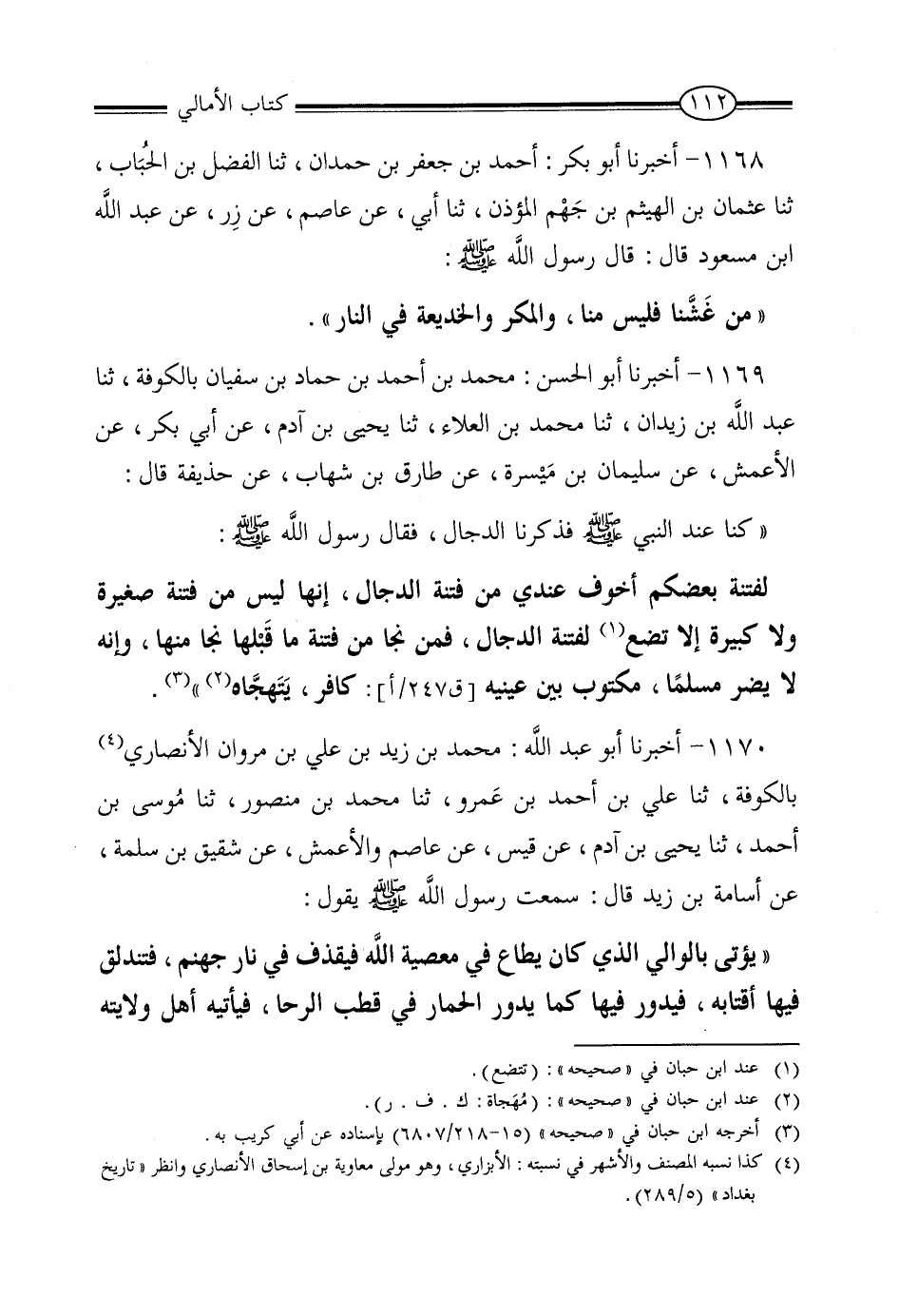 1168 - أَخْبَرَنَا أَبُو بَكْرٍ أَحْمَدُ بْنُ جَعْفَرِ بْنِ حَمْدَانَ , ثنا الْفَضْلُ بْنُ الْحُبَابِ , ثنا عُثْمَانُ بْنُ الْهَيْثَمِ بْنِ جَهْمٍ الْمُؤَذِّنُ , ثنا أَبِي , عَنْ عَاصِمٍ , عَنْ زِرٍّ , عَنْ عَبْدِ اللَّهِ بْنِ مَسْعُودٍ , قَالَ: قَالَ رَسُولُ اللَّهِ صَلَّى اللَّهُ عَلَيْهِ وَسَلَّمَ: «مَنْ غَشَّنَا فَلَيْسَ مِنَّا، وَالْمَكْرُ وَالْخَدِيعَةُ فِي النَّارِ»