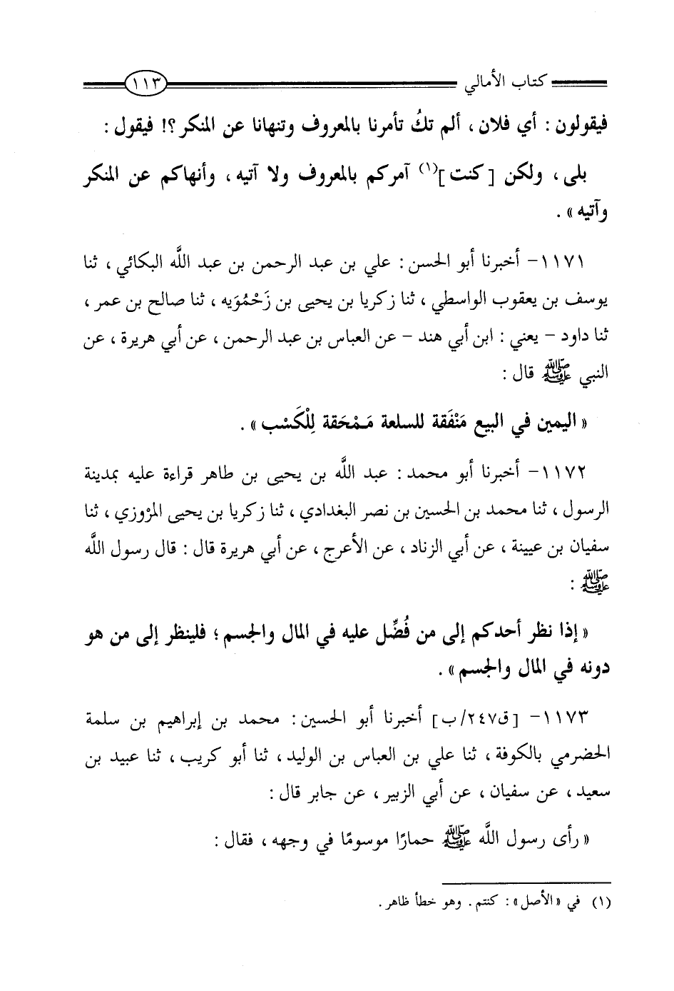 1173 - أَخْبَرَنَا أَبُو الْحُسَيْنِ مُحَمَّدُ بْنُ إِبْرَاهِيمَ بْنِ سَلَمَةَ الْحَضْرَمِيُّ , بِالْكُوفَةِ , ثنا عَلِيُّ بْنُ الْعَبَّاسِ بْنِ الْوَلِيدِ , ثنا أَبُو كُرَيْبٍ , ثنا عُبَيْدُ بْنُ سَعِيدٍ , عَنْ سُفْيَانَ , عَنْ أَبِي الزُّبَيْرِ , عَنْ جَابِرٍ , قَالَ: رَأَى رَسُولُ اللَّهِ صَلَّى اللَّهُ عَلَيْهِ وَسَلَّمَ حِمَارًا مَوْسُومًا فِي وَجْهِهِ، فَقَالَ: