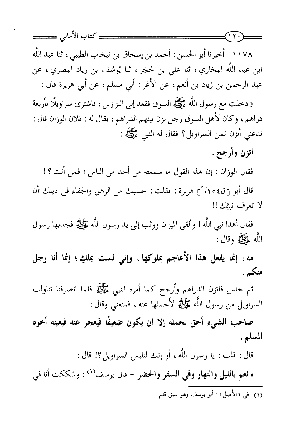 1178 - أَخْبَرَنَا أَبُو الْحَسَنِ أَحْمَدُ بْنُ إِسْحَاقَ بْنِ بُنْجَابٍ الطَّيِّبِيُّ، ثنا عَبْدُ اللَّهِ بْنُ عَبْدِ اللَّهِ الْبُخَارِيُّ، ثنا عَلِيُّ بْنُ حُجْرٍ، ثنا يُوسُفُ بْنُ زِيَادٍ الْبَصْرِيُّ، عَنْ عَبْدِ الرَّحْمَنِ بْنِ زِيَادِ بْنِ أَنْعَمَ، عَنِ الأَغَرِّ أَبِي مُسْلِمٍ، عَنْ أَبِي هُرَيْرَةَ، قَالَ: دَخَلْتُ مَعَ رَسُولِ اللَّهِ صَلَّى اللَّهُ عَلَيْهِ وَسَلَّمَ السُّوقَ، فَقَعَدَ إِلَى الْبَزَّازِينَ فَاشْتَرَى سَرَاوِيلَ بِأَرْبَعَةِ دَرَاهِمَ، قَالَ: وَكَانَ لأَهْلِ السُّوقِ رَجُلٌ يَزِنُ بَيْنَهُمُ الدَّرَاهِمَ، يُقَالُ لَهُ: فُلانٌ الْوَزَّانُ، قَالَ: فَدُعِيَ لِيَتَّزِنَ ثَمَنَ السَّرَاوِيلِ، فَقَالَ لَهُ النَّبِيُّ صَلَّى اللَّهُ عَلَيْهِ وَسَلَّمَ: «اتَّزِنْ وَأَرْجِحْ» فَقَالَ الْوَزَّانُ: إِنَّ هَذَا لَقَوْلٌ مَا سَمِعْتُهُ مِنْ أَحَدٍ مِنَ النَّاسِ، فَمَنْ أَنْتَ؟ قَالَ أَبُو هُرَيْرَةَ: فَقُلْتُ: حَسْبُكَ مِنَ الرَّهَقِ وَالْجَفَاءِ فِي دِينِكَ، أَنْ لا تَعْرِفَ نَبِيَّكَ، فَقَالَ: أَهَذَا نَبِيُّ اللَّهِ؟ وَأَلْقَى الْمِيزَانَ، وَوَثَبَ إِلَى يَدِ رَسُولِ اللَّهِ صَلَّى اللَّهُ عَلَيْهِ وَسَلَّمَ، فَجَذَبَهَا رَسُولُ اللَّهِ صَلَّى اللَّهُ عَلَيْهِ وَسَلَّمَ، وَقَالَ: «مَهْ، إِنَّمَا يَفْعَلُ هَذَا الأَعَاجِمَ بِمُلُوكِهَا، وَإِنِّي لَسْتُ بِمَلِكٍ إِنَّمَا أَنَا رَجُلٌ مِنْكُمْ» ثُمَّ جَلَسَ، فَاتَّزَنَ الدَّرَاهِمَ، وَأَرْجَحَ كَمَا أَمَرَهُ النَّبِيُّ صَلَّى اللَّهُ عَلَيْهِ وَسَلَّمَ، فَلَمَّا انْصَرَفْنَا تَنَاوَلْتُ السَّرَاوِيلَ مِنْ رَسُولِ اللَّهِ صَلَّى اللَّهُ عَلَيْهِ وَسَلَّمَ، لأَحْمِلَهَا عَنْه، فَمَنَعَنِي، وَقَالَ: «صَاحِبُ الشَّيْءِ أَحَقُّ بِحَمْلِهِ، إِلا أَنْ يَكُونَ ضَعِيفًا يَعْجَزُ عَنْهُ، فَيُعِينُهُ أَخُوهُ الْمُسْلِمُ» ، قَالَ: قُلْتُ: يَا رَسُولَ اللَّهِ أَوَ إِنَّكَ لَتَلْبَسُ السَّرَاوِيلَ؟ قَالَ: " نَعَمْ بِاللَّيْلِ وَالنَّهَارِ، وَفِي السَّفَرِ وَالْحَضَرِ، قَالَ أَبُو يُوسُفَ: وَشَكَكْتُ أَنَا فِي