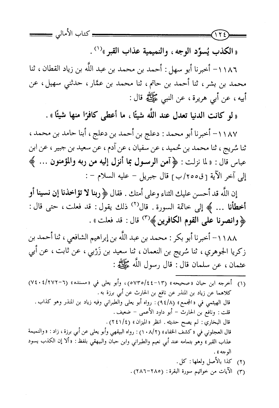 1187 - أَخْبَرَنَا أَبُو مُحَمَّدٍ دَعْلَجُ بْنُ أَحْمَدَ بْنِ دَعْلَجٍ، أَنبا حَامِدُ بْنُ مُحَمَّدٍ، ثنا سُرَيْجٌ، ثنا مُحَمَّدُ بْنُ حُمَيْدٍ، عَنْ سُفْيَانَ، عَنْ آدَمَ، عَنْ سَعِيدِ بْنِ جُبَيْرٍ، عَنْ ابْنِ عَبَّاسٍ، قَالَ: لَمَّا نَزَلَتْ: " {آمَنَ الرَّسُولُ بِمَا أُنْزِلَ إِلَيْهِ مِنْ رَبِّهِ وَالْمُؤْمِنُونَ} [البقرة: 285] .