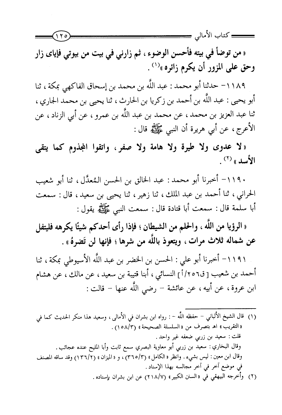 1190 - أَخْبَرَنَا أَبُو مُحَمَّدٍ عَبْدُ الْخَالِقِ بْنُ الْحَسَنِ الْمُعَدِّلُ، ثنا أَبُو شُعَيْبٍ الْحَرَّانِيُّ، ثنا أَحْمَدُ بْنُ عَبْدِ الْمَلِكِ، ثنا زُهَيْرٌ، ثنا يَحْيَى بْنُ سَعِيدٍ، قَالَ: سَمِعْتُ أَبَا سَلَمَةَ، قَالَ: سَمِعْتُ أَبَا قَتَادَةَ، قَالَ: سَمِعْتُ النَّبِيَّ صَلَّى اللَّهُ عَلَيْهِ وَسَلَّمَ، يَقُولُ: «الرُّؤْيَا مِنَ اللَّهِ، وَالْحُلْمُ مِنَ الشَّيْطَانِ، فَإِذَا رَأَى أَحَدُكُمْ شَيْئًا يَكْرَهُهُ فَلْيَتْفِلْ عَنْ شِمَالِهِ ثَلاثَ مَرَّاتٍ، وَيَتَعَوَّذْ بِاللَّهِ مِنْ شَرِّهَا، فَإِنَّهَا لَنْ تَضُرَّهُ»
