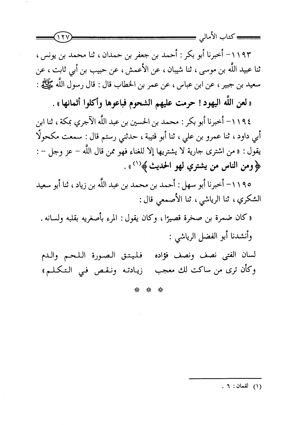 1194 - أَخْبَرَنَا أَبُو بَكْرٍ مُحَمَّدُ بْنُ الْحُسَيْنِ بْنِ عَبْدِ اللَّهِ الآجُرِّيُّ، بِمَكَّةَ، ثنا ابْنُ أَبِي دَاوُدَ، ثنا عَمْرُو بْنُ عَلِيٍّ، ثنا أَبُو قُتَيْبَةَ، حَدَّثَنِي رُسْتُمُ، قَالَ: سَمِعْتُ مَكْحُولا، يَقُولُ: مَنِ اشْتَرَى جَارِيَةً لا يَشْتَرِيهَا إِلا لِلْغِنَاءِ، فَهُوَ مِمَّنْ قَالَ اللَّهُ عَزَّ وَجَلَّ: {وَمِنَ النَّاسِ مَنْ يَشْتَرِي لَهْوَ الْحَدِيثِ} [لقمان: 6] .