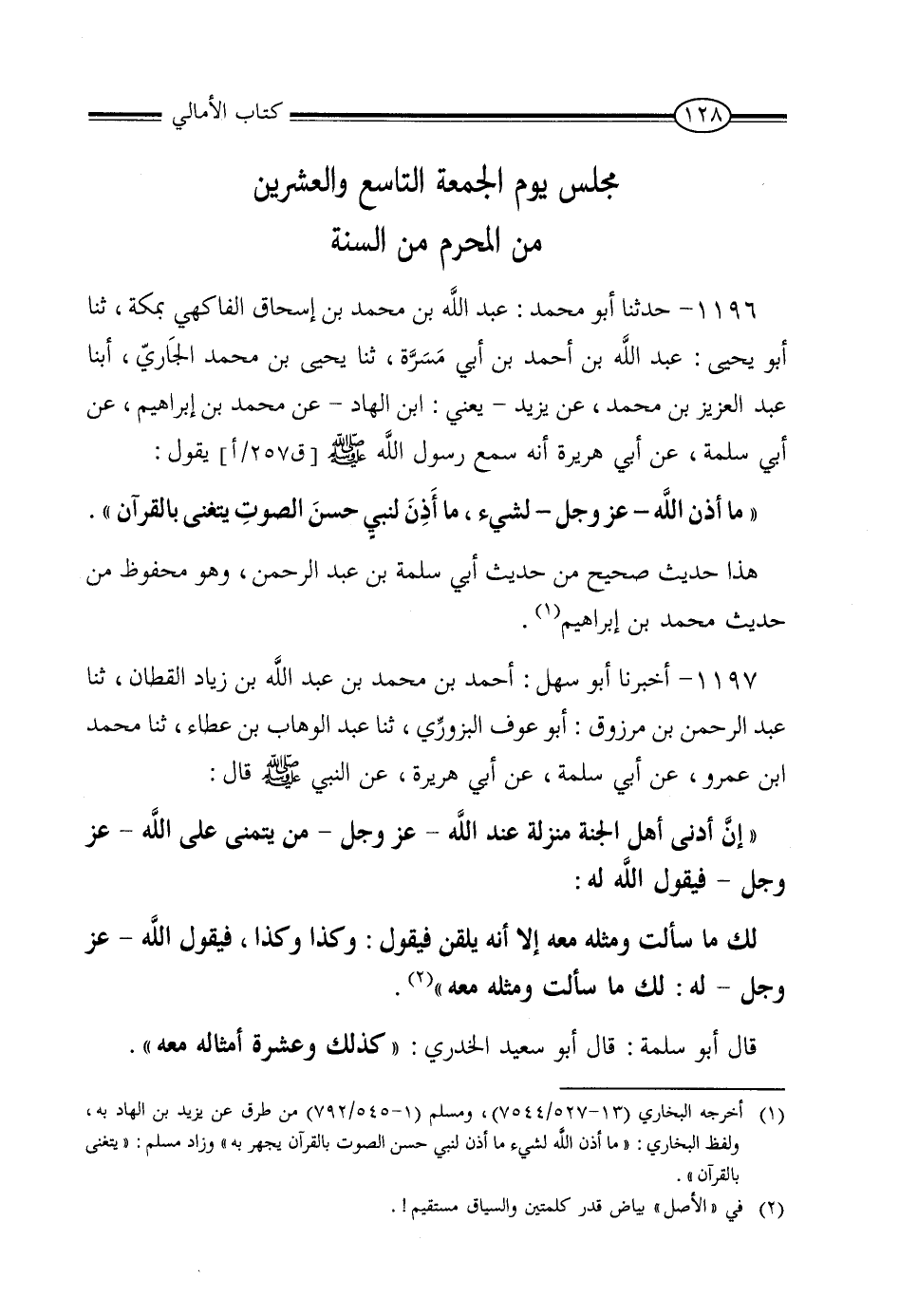 1196 - حَدَّثَنَا أَبُو مُحَمَّدٍ عَبْدُ اللَّهِ بْنُ مُحَمَّدِ بْنِ إِسْحَاقَ الْفَاكِهِيُّ، بِمَكَّةَ، ثنا أَبُو يَحْيَى عَبْدُ اللَّهِ بْنُ أَحْمَدَ بْنِ أَبِي مَسَرَّةَ، ثنا يَحْيَى بْنُ مُحَمَّدٍ الْجَارِي، أَنبا عَبْدُ الْعَزِيزِ بْنُ مُحَمَّدٍ، عَنْ يَزِيدَ يَعْنِي ابْنَ الْهَادِي، عَنْ مُحَمَّدِ بْنِ إِبْرَاهِيمَ، عَنْ أَبِي سَلَمَةَ، عَنْ أَبِي هُرَيْرَةَ، أَنَّهُ سَمِعَ رَسُولَ اللَّهِ صَلَّى اللَّهُ عَلَيْهِ وَسَلَّمَ، يَقُولُ: «مَا أَذِنَ اللَّهُ عَزَّ وَجَلَّ لِشَيْءٍ، مَا أَذِنَ لِنَبِيٍّ حَسَنِ الصَّوْتِ أَنْ يَتَغَنَّى بِالْقُرْآنِ» .