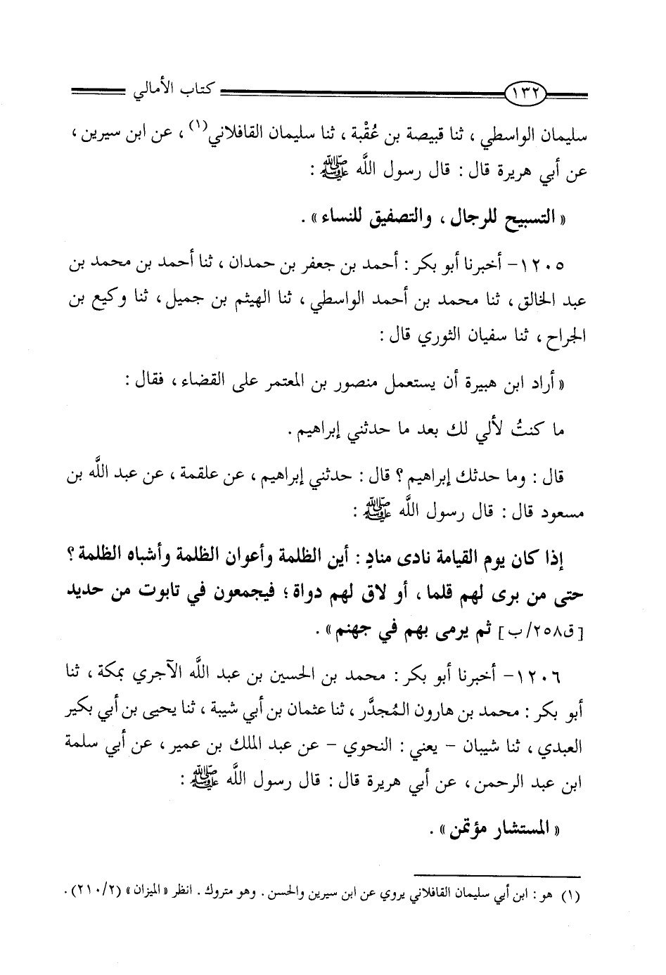 سُلَيْمَانَ الْوَاسِطِيُّ، ثنا قَبِيصَةُ بْنُ عُقْبَةَ، ثنا سُلَيْمَانُ الْقَافِلانِيُّ، عَنِ ابْنِ سِيرِينَ، عَنْ أَبِي هُرَيْرَةَ، قَالَ: قَالَ رَسُولُ اللَّهِ صَلَّى اللَّهُ عَلَيْهِ وَسَلَّمَ: «التَّسْبِيحُ لِلرِّجَالِ وَالتَّصْفِيقُ لِلنِّسَاءِ»