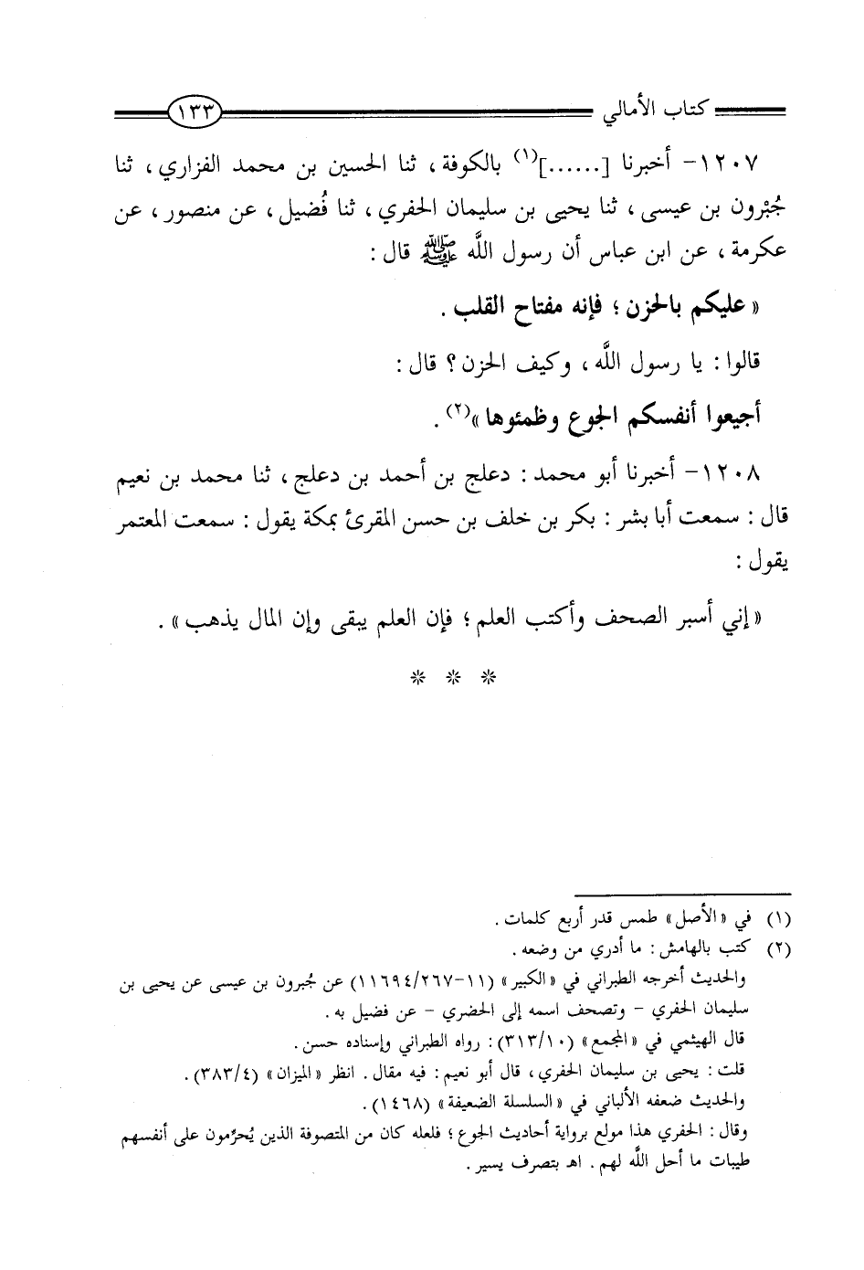 1207 - أَخْبَرَنَا مُحَمَّدُ بْنُ سُفْيَانَ، بِالْكُوفَةِ، ثنا الْحُسَيْنُ بْنُ مُحَمَّدٍ الْفَزَارِيُّ، ثنا جَبْرُونُ بْنُ عِيسَى، ثنا يَحْيَى بْنُ سُلَيْمَانَ الْحَفْرِيُّ، ثنا فُضَيْلٌ، عَنْ عِكْرِمَةَ، عَنِ ابْنِ عَبَّاسٍ، أَنّ رَسُولَ اللَّهِ صَلَّى اللَّهُ عَلَيْهِ وَسَلَّمَ، قَالَ: «عَلَيْكُمْ بِالْحُزْنِ فَإِنَّهُ مِفْتَاحُ الْقَلْبِ» قَالُوا: يَا رَسُولَ اللَّهِ وَكَيْفَ الْحُزْنُ؟ قَالَ: «أَحْزِنُوا أَنْفُسَكُمْ بِالْجُوعِ وَظَمِّئُوهُا»