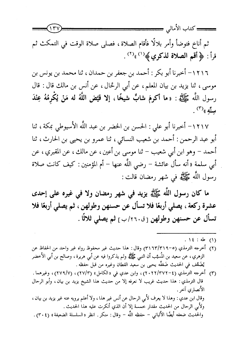 1217 - أَخْبَرَنَا أَبُو عَلِيٍّ الْحَسَنُ بْنُ الْخَضِرِ بْنِ عَبْدِ اللَّهِ الأَسْيُوطِيُّ، بِمَكَّةَ، ثنا أَبُو عَبْدِ الرَّحْمَنِ أَحْمَدُ بْنُ شُعَيْبٍ النَّسَائِيُّ، أَنبا عَمْرُو بْنُ يَحْيَى بْنِ الْحَارِثِ، ثنا أَحْمَدُ، وَهُوَ ابْنُ أَبِي شُعَيْبٍ، ثنا مُوسَى بْنُ أَعْيَنَ، عَنْ مَالِكٍ، عَنِ الْمَقْبُرِيِّ، عَنْ أَبِي سَلَمَةَ، أَنَّهُ سَأَلَ عَائِشَةَ رَضِيَ اللَّهُ عَنْهَا أُمَّ الْمُؤْمِنِينَ: " كَيْفَ كَانَتْ صَلاةُ رَسُولِ اللَّهِ صَلَّى اللَّهُ عَلَيْهِ وَسَلَّمَ فِي شَهْرِ رَمَضَانَ؟ قَالَتْ: مَا كَانَ رَسُولُ اللَّهِ صَلَّى اللَّهُ عَلَيْهِ وَسَلَّمَ يَزِيدُ فِي شَهْرِ رَمَضَانَ وَلا فِي غَيْرِهِ عَلَى إِحْدَى عَشْرَةَ رَكْعَةً، يُصَلِّي أَرْبَعًا، وَلا تَسْأَلْ عَنْ حُسْنِهِنَّ وَطُولِهِنَّ، ثُمَّ يُصَلِّي أَرْبَعًا، فَلا تَسْأَلْ عَنْ حُسْنِهِنَّ وَطُولِهِنَّ، ثُمَّ يُصَلِّي ثَلاثًا،