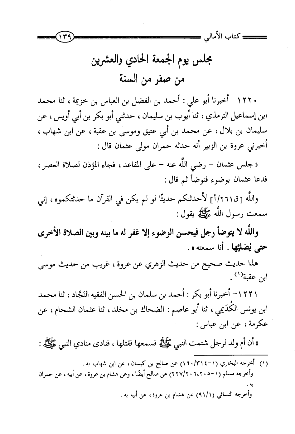 1220 - أَخْبَرَنَا أَبُو عَلِيٍّ أَحْمَدُ بْنُ الْفَضْلِ بْنِ الْعَبَّاسِ بْنِ خُزَيْمَةَ، ثنا مُحَمَّدُ بْنُ إِسْمَاعِيلَ التِّرْمِذِيُّ، ثنا أَيُّوبُ بْنُ سُلَيْمَانَ، حَدَّثَنِي أَبُو بَكْرِ بْنُ أَبِي أُوَيْسٍ، عَنْ سُلَيْمَانَ بْنِ بِلالٍ، عَنْ مُحَمَّدِ بْنِ أَبِي عَتِيقٍ، وَمُوسَى بْنِ عُقْبَةَ، عَنِ ابْنِ شِهَابٍ، أَخْبَرَنِي عُرْوَةُ بْنُ الزُّبَيْرِ، أَنَّه حَدَّثَهُ حُمْرَانُ، مَوْلَى عُثْمَانَ، قَالَ: جَلَسَ عُثْمَانُ رَضِيَ اللَّهُ عَنْهُ عَلَى الْمَقَاعِدِ، فَجَاءَهُ الْمُؤَذِّنُ لِصَلاةِ الْعَصْرِ، فَدَعَا عُثْمَانُ بِوُضُوءٍ فَتَوَضَّأَ، ثُمَّ قَالَ: وَاللَّهِ لأُحَدِّثُكُمْ حَدِيثًا لَوْ لَمْ يَكُنْ فِي الْقُرْآنِ مَا حَدَّثْتُكُمُوهُ، إِنِّي سَمِعْتُ رَسُولَ اللَّهِ صَلَّى اللَّهُ عَلَيْهِ وَسَلَّمَ، يَقُولُ: «وَاللَّهِ، لا يَتَوَضَّأُ رَجُلٌ، فَيُحْسِنُ الْوُضُوءَ، إِلا غُفِرَ لَهُ مَا بَيْنَهُ وَبَيْنَ الصَّلاةِ الأُخْرَى، حَتَّى يُصَلِّيَهَا» .