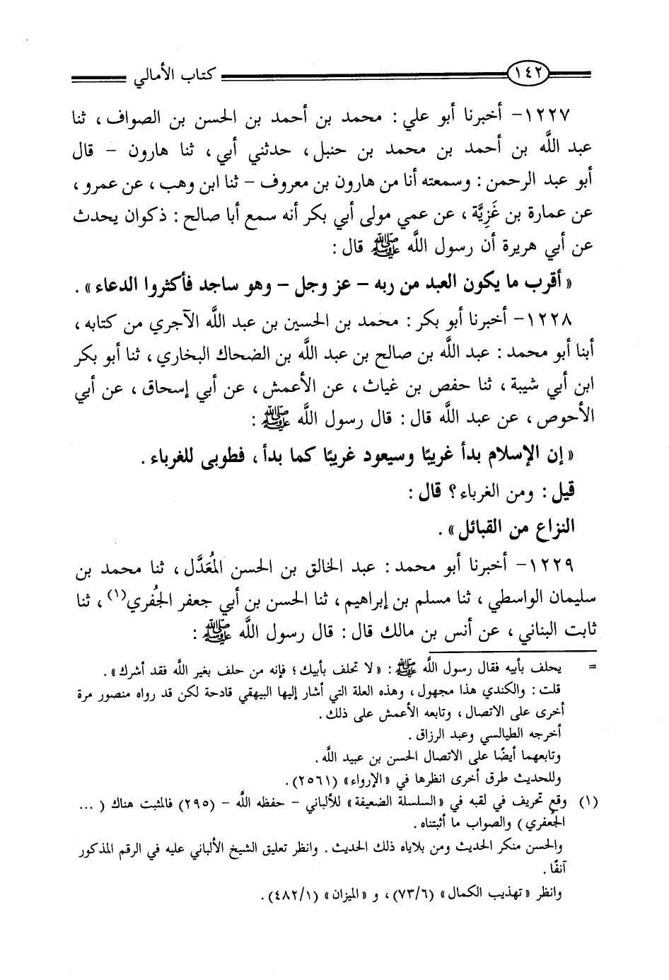 1227 - أَخْبَرَنَا أَبُو عَلِيٍّ مُحَمَّدُ بْنُ أَحْمَدَ بْنِ الْحَسَنِ بْنِ الصَّوَّافِ، ثنا عَبْدُ اللَّهِ بْنُ أَحْمَدَ بْنِ مُحَمَّدِ بْنِ حَنْبَلٍ، حَدَّثَنِي أَبِي، ثنا هَارُونُ، قَالَ: أَبُو عَبْدِ الرَّحْمَنِ، وَسَمِعْتُهُ أَنا، مِنْ هَارُونَ بْنِ مَعْرُوفٍ، ثنا ابْنُ وَهْبٍ، عَنْ عَمْرٍو، عَنْ عُمَارَةَ بْنِ غَزِيَّةَ، عَنْ سُمَيٍّ، مَوْلَى أَبِي بَكْرٍ، أَنَّهُ سَمِعَ أَبَا صَالِحِ بْنَ ذَكْوَانَ، يُحَدِّثُ عَنْ أَبِي هُرَيْرَةَ، أَنَّ رَسُولَ اللَّهِ صَلَّى اللَّهُ عَلَيْهِ وَسَلَّمَ، قَالَ: «أَقْرَبُ مَا يَكُونُ الْعَبْدُ مِنْ رَبِّهِ عَزَّ وَجَلَّ وَهُوَ سَاجِدٌ، فَأَكْثِرُوا الدُّعَاءَ»