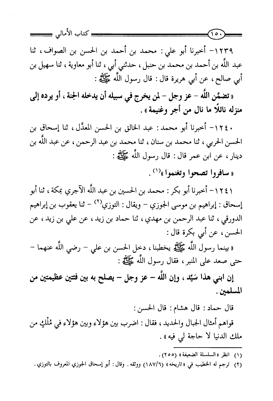 1241 - أَخْبَرَنَا أَبُو بَكْرٍ مُحَمَّدُ بْنُ الْحُسَيْنِ بْنِ عَبْدِ اللَّهِ الآجُرِّيُّ , بِمَكَّةَ , أنبا أَبُو إِسْحَاقَ إِبْرَاهِيمُ بْنُ مُوسَى الْجَوْزِيُّ وَيُقَالُ: التَّوَّزِيُّ , ثنا يَعْقُوبُ بْنُ إِبْرَاهِيمَ الدَّوْرَقِيُّ , ثنا عَبْدُ الرَّحْمَنِ بْنُ مَهْدِيٍّ , ثنا حَمَّادُ بْنُ زَيْدٍ , عَنْ عَلِيِّ بْنِ زَيْدٍ , عَنِ الْحَسَنِ , عَنْ أَبِي بَكْرَةَ , قَالَ: بَيْنَا رَسُولُ اللَّهِ صَلَّى اللَّهُ عَلَيْهِ وَسَلَّمَ يَخْطُبُ إِذْ جَاءَ الْحَسَنُ بْنُ عَلِيٍّ رَضِيَ اللَّهُ عَنْهُمَا حَتَّى صَعَدَ عَلَى الْمِنْبَرِ , فَقَالَ رَسُولُ اللَّهِ صَلَّى اللَّهُ عَلَيْهِ وَسَلَّمَ: " إِنَّ ابْنِي هَذَا سَيِّدٌ , وَإِنَّ اللَّهَ عَزَّ وَجَلَّ يُصْلِحُ بِهِ بَيْنَ فِئَتَيْنِ عَظِيمَتَيْنِ مِنَ الْمُسْلِمِينَ قَالَ حَمَّادٌ: قَالَ هِشَامٌ: قَالَ الْحَسَنُ: تَرَاهُمْ أَمْثَالَ الْجِبَالِ فِي الْحَدِيدِ , فَقَالَ: أَضْرِبُ بَيْنَ هَؤُلاءِ وَبَيْنَ هَؤُلاءِ فِي مُلْكٍ مِنْ مُلْكِ الدُّنْيَا لا حَاجَةَ لِي فِيهِ "