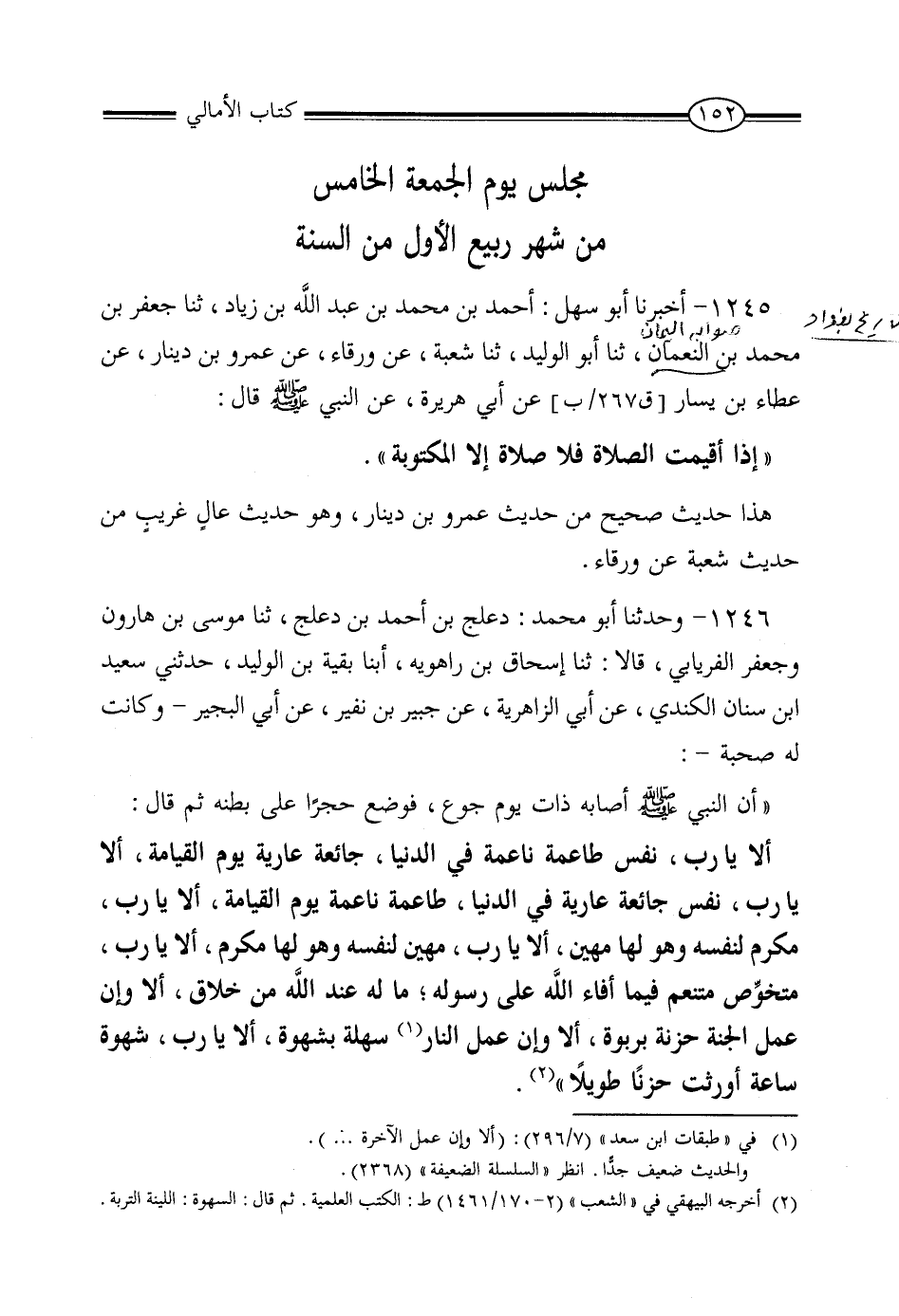 1246 - أَخْبَرَنَا أَبُو مُحَمَّدٍ دَعْلَجُ بْنُ أَحْمَدَ بْنِ دَعْلَجٍ , ثنا مُوسَى بْنُ هَارُونَ , وَجَعْفَرٌ الْفِرْيَانِيُّ , قَالا: ثنا إِسْحَاقُ بْنُ رَاهَوَيْهِ , أنبا بَقِيَّةُ بْنُ الْوَلِيدِ , حَدَّثَنِي سَعِيدُ بْنُ سِنَانٍ الْكِنْدِيُّ , عَنْ أَبِي الزَّاهِرِيَّةِ , عَنْ جُبَيْرِ بْنِ نُفَيْرٍ , عَنِ ابْنِ الْبُجَيْرِ وَكَانَتْ لَهُ صُحْبَةٌ , أَنَّ النَّبِيَّ صَلَّى اللَّهُ عَلَيْهِ وَسَلَّمَ أَصَابَهُ ذَاتَ يَوْمٍ جُوعٌ، فَوَضَعَ حَجَرًا عَلَى بَطْنِهِ , ثُمَّ قَالَ: «أَلا يَا رُبَّ نَفْسٍ طَاعِمَةٍ نَاعِمَةٍ فِي الدُّنْيَا جَائِعَةٌ عَارِيَةٌ يَوْمَ الْقِيَامَةِ , أَلا يَا رُبَّ نَفْسٍ جَائِعَةٍ عَارِيَةٍ فِي الدُّنْيَا طَاعِمَةٌ نَاعِمَةٌ يَوْمَ الْقِيَامَةِ , أَلا يَا رُبَّ مُكْرِمٍ لِنَفْسِهِ وَهُوَ لَهَا مُهِينٌ , أَلا يَا رُبَّ مُهِينٍ لِنَفْسِهِ وَهُوَ لَهَا مُكْرِمٌ , أَلا يَا رُبَّ مُتَخَوِّضٍ مُتَنَعِّمٍ فِيمَا أَفَاءَ اللَّهُ عَلَى رَسُولِهِ مَا لَهُ عِنْدَ اللَّهِ مِنْ خَلاقٍ , أَلا وَإِنَّ عَمَلَ الْجَنَّةِ حَزْنَةٌ بِرَبْوَةٍ , أَلا وَإِنَّ عَمَلَ النَّارِ سَهْلَةٌ بِشَهْوَةٍ , أَلا يَا رُبَّ شَهْوَةِ سَاعَةٍ أَوْرَثَتْ حُزْنًا طَوِيلا»