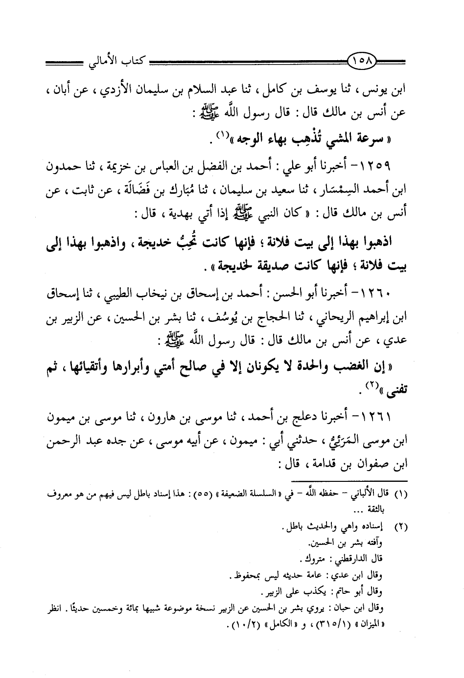 بْنُ يُونُسَ , ثنا يُوسُفُ بْنُ كَامِلٍ , ثنا عَبْدُ السَّلامِ بْنُ سُلَيْمَانَ الأَزْدِيُّ , عَنْ أَبَانَ , عَنْ أَنَسِ بْنِ مَالِكٍ , قَالَ: قَالَ رَسُولُ اللَّهِ صَلَّى اللَّهُ عَلَيْهِ وَسَلَّمَ: «سُرْعَةُ الْمَشْيِ يُذْهِبُ بَهَاءَ الْوَجْهِ»