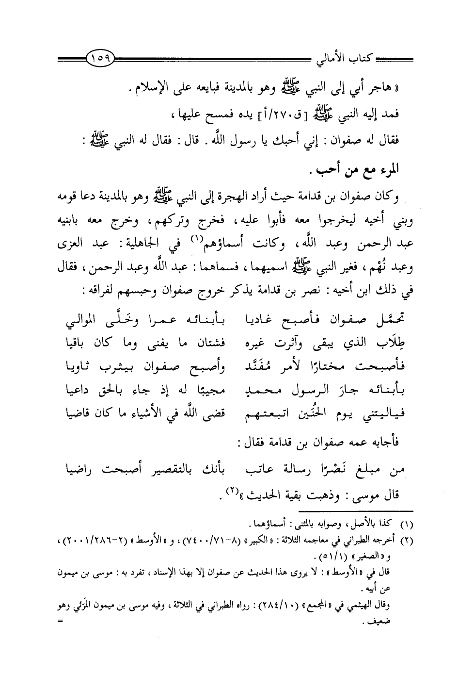 وَكَانَ صَفْوَانُ بْنُ قُدَامَةَ حَيْثُ أَرَادَ الْهِجْرَةَ إِلَى النَّبِيِّ صَلَّى اللَّهُ عَلَيْهِ وَسَلَّمَ وَهُوَ بِالْمَدِينَةِ، دَعَا قَوْمَهُ وَبَنِي أَخِيهِ لِيَخْرُجُوا مَعَهُ , فَأَبَوْا عَلَيْهِ , فَخَرَجَ وَتَرَكَهُمْ , وَخَرَجَ مَعَهُ بِابْنَيْهِ عَبْدِ الرَّحْمَنِ وَعَبْدِ اللَّهِ , وَكَانَتْ أَسْمَاؤُهُمْ فِي الْجَاهِلِيَّةِ عَبْدَ الْعُزَّى وَعَبْدَ نُهْمٍ فَغَيَّرَ النَّبِيُّ صَلَّى اللَّهُ عَلَيْهِ وَسَلَّمَ اسْمَيْهِمَا، فَسَمَّاهُمَا عَبْدَ الرَّحْمَنِ وَعَبْدَ اللَّهِ , فَقَالَ فِي ذَلِكَ ابْنُ أَخِيهِ نَصْرُ بْنُ قُدَامَةَ يَذْكُرُ خُرُوجَ صَفْوَانَ وَوَحْشَتَهُمْ لِفُرَاقِهِ: