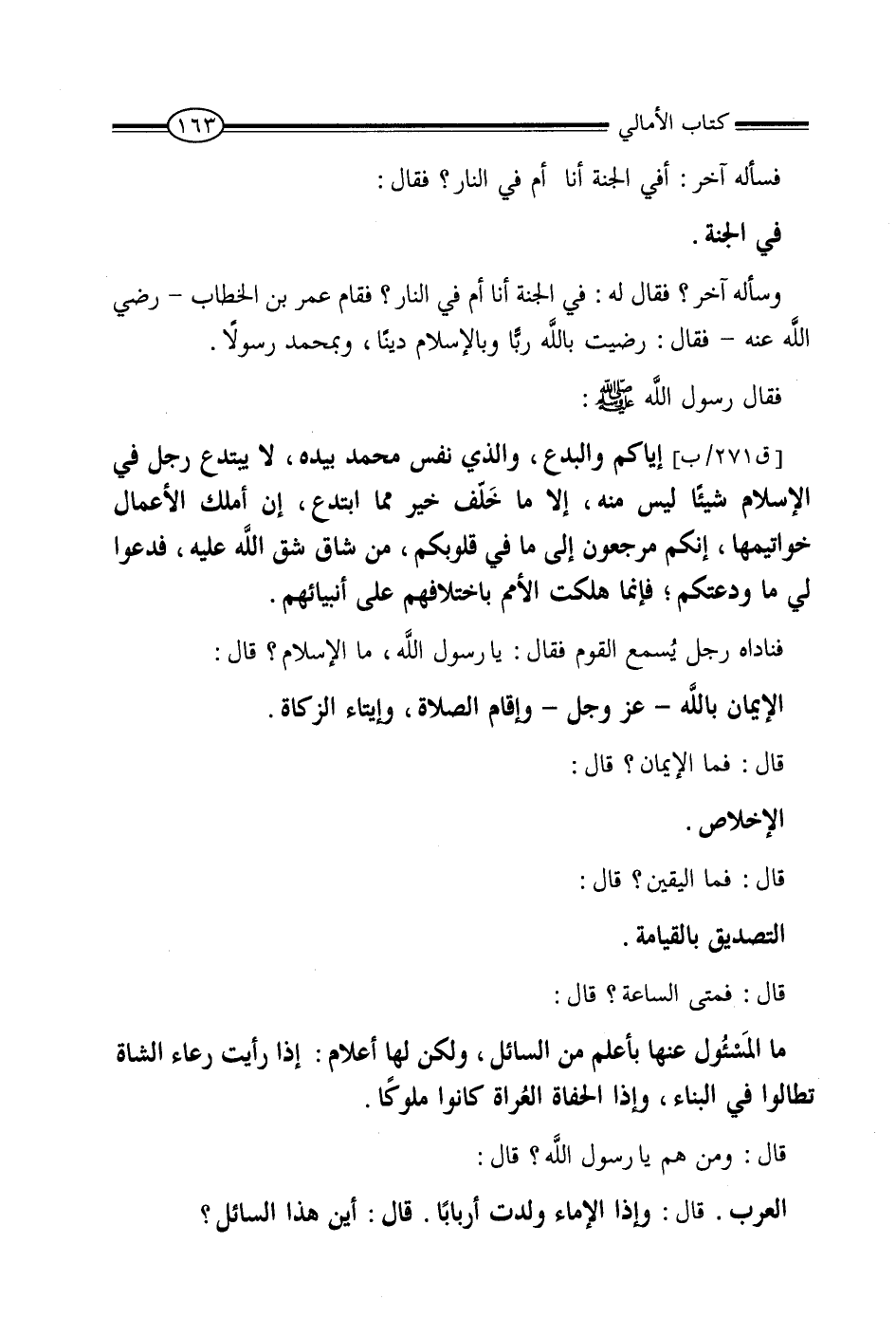 فَسَأَلَهُ آخَرُ: أَفِي الْجَنَّةِ أَنَا أَمْ فِي النَّارِ؟ فَقَالَ: «فِي الْجَنَّةِ» , وَسَأَلَهُ آخَرُ، فَقَالَ: أَفِي الْجَنَّةِ أَنَا أَمْ فِي النَّارِ؟ فَقَامَ عُمَرُ بْنُ الْخَطَّابِ رَضِيَ اللَّهُ عَنْهُ، فَقَالَ: رَضِيتُ بِاللَّهِ رَبًّا وَبِالإِسْلامِ دِينًا وَبِمُحَمَّدٍ رَسُولا , فَقَالَ رَسُولُ اللَّهِ صَلَّى اللَّهُ عَلَيْهِ وَسَلَّمَ: «إِيَّاكَ وَالْبِدَعَ؛ وَالَّذِي نَفْسُ مُحَمَّدٍ بِيَدِهِ لا يَبْتَدِعُ رَجُلٌ فِي الإِسْلامِ شَيْئًا لَيْسَ مِنْهُ، أَلا مَا خَلَّفَ خَيْرٌ مِمَّا ابْتَدَعَ , إِنَّ أَمْلَكَ الأَعْمَالِ خَوَاتِيمُهَا , إِنَّكُمْ مَرْجُوعُونَ إِلَى مَا فِي قُلُوبِكُمْ , مَنْ شَاقَّ شَقَّ اللَّهُ عَلَيْهِ فَدَعُونِي مَا وَدَعْتُكُمْ؛ فَإِنَّمَا هَلَكَتِ الأُمَمُ بِاخْتِلافِهِمْ عَلَى أَنْبِيَائِهِمْ» , فَنَادَاهُ رَجُلٌ فَسَمِعَ الْقَوْمَ فَقَالَ: يَا رَسُولَ اللَّهِ، مَا الإِسْلامُ؟ قَالَ: «الإِيمَانُ بِاللَّهِ عَزَّ وَجَلَّ , وَإِقَامُ الصَّلاةِ وَإِيتَاءُ الزَّكَاةِ» , قَالَ: فَمَا الإِيمَانُ؟ قَالَ: «الإِخْلاصُ» , قَالَ: فَمَا الْيَقِينُ؟ قَالَ: «التَّصْدِيقُ بِالْقِيَامَةِ» , قَالَ: فَمَتَى السَّاعَةُ؟ قَالَ: «مَا الْمَسْئُولُ عَنْهَا بِأَعْلَمَ مِنَ السَّائِلِ , وَلَكِنْ لَهَا أَعْلامٌ , إِذَا رَأَيْتَ رُعَاةَ الشَّاةِ تَطَاوَلُوا فِي الْبِنَاءِ , وَإِذَا الْحُفَاةُ الْعُرَاةُ كَانُوا مُلُوكًا» , قَالَ: وَمَنْ هُمْ يَا رَسُولَ اللَّهِ؟ قَالَ: «الْعَرَبُ» , قَالَ: «وَإِذَا الإِمَاءُ وَلَدْنَ أَرْبَابًا» , قَالَ: «أَيْنَ هَذَا السَّائِلُ؟»