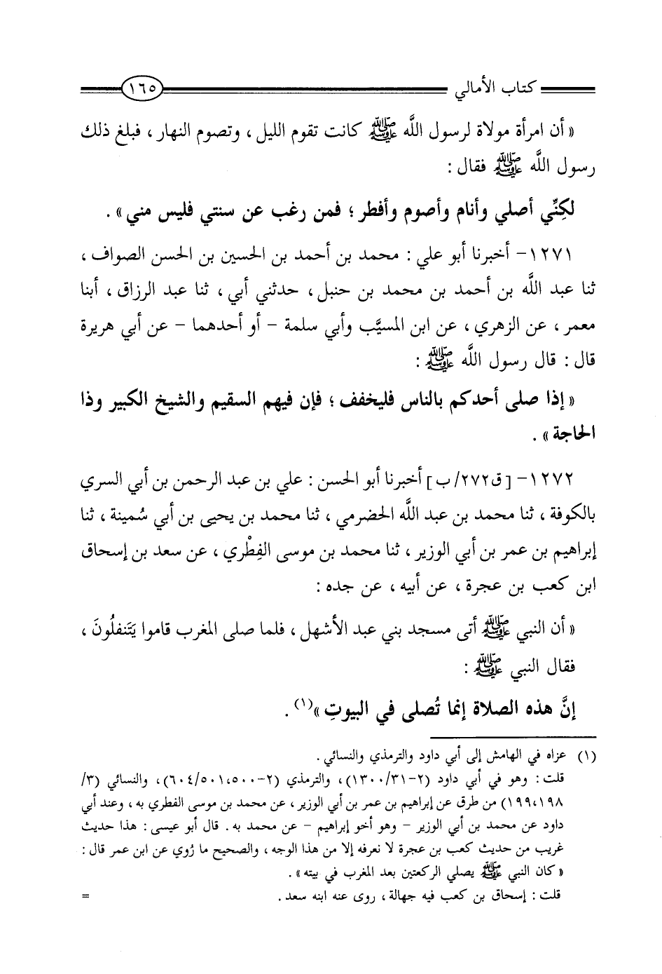 1272 - أَخْبَرَنَا أَبُو الْحَسَنِ عَلِيُّ بْنُ عَبْدِ الرَّحْمَنِ بْنِ أَبِي السَّرِيِّ , بِالْكُوفَةِ , ثنا مُحَمَّدُ بْنُ عَبْدِ اللَّهِ الْحَضْرَمِيُّ , ثنا مُحَمَّدُ بْنُ يَحْيَى بْنِ أَبِي سُمَيْنَةَ , ثنا إِبْرَاهِيمُ بْنُ عُمَرَ بْنِ أَبِي الْوَزِيرِ , ثنا مُحَمَّدُ بْنُ مُوسَى الْفِطْرِيُّ , عَنْ سَعْدِ بْنِ إِسْحَاقَ بْنِ كَعْبِ بْنِ عُجْرَةَ , عَنْ أَبِيهِ , عَنْ جَدِّهِ , أَنّ النَّبِيَّ صَلَّى اللَّهُ عَلَيْهِ وَسَلَّمَ أَتَى مَسْجِدَ بَنِي عَبْدِ الأَشْهَلِ , فَلَمَّا صَلَّى الْمَغْرِبَ قَامُوا يَتَنَفَّلُونَ , فَقَالَ النَّبِيُّ صَلَّى اللَّهُ عَلَيْهِ وَسَلَّمَ: «إِنَّ هَذِهِ الصَّلاةُ إِنَّمَا تُصَلَّى فِي الْبُيُوتِ»