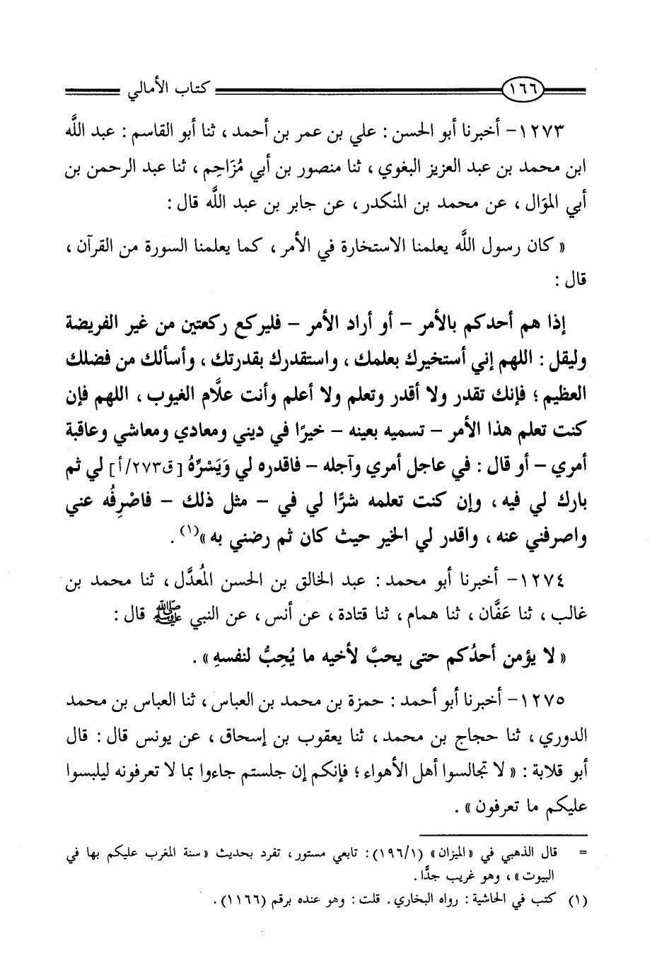 1273 - أَخْبَرَنَا أَبُو الْحَسَنِ عَلِيُّ بْنُ عُمَرَ بْنِ أَحْمَدَ , ثنا أَبُو الْقَاسِمِ عَبْدُ اللَّهِ بْنُ مُحَمَّدِ بْنِ عَبْدِ الْعَزِيزِ الْبَغَوِيُّ , ثنا مَنْصُورُ بْنُ أَبِي مُزَاحِمٍ , ثنا عَبْدُ الرَّحْمَنِ بْنُ أَبِي الْمَوَالِ , عَنْ مُحَمَّدِ بْنِ الْمُنْكَدِرِ , عَنْ جَابِرِ بْنِ عَبْدِ اللَّهِ , قَالَ: كَانَ رَسُولُ اللَّهِ صَلَّى اللَّهُ عَلَيْهِ وَسَلَّمَ يُعَلِّمُنَا الاسْتِخَارَةَ فِي الأَمْرِ كَمَا يُعَلِّمُنَا السُّورَةَ مِنَ الْقُرْآنِ , قَالَ: " إِذَا هَمَّ أَحَدُكُمْ بِالأَمْرِ لَوْ أَرَادَ الأَمْرَ فَلْيَرْكَعْ رَكْعَتَيْنِ مِنْ غَيْرِ الْفَرِيضَةِ فَلْيَقُلْ: اللَّهُمَّ إِنِّي أَسْتَخِيرُكَ بِعِلْمِكَ وَأَسْتَقْدِرُكَ بِقُدْرَتِكَ , وَأَسْأَلُكَ مِنْ فَضْلِكَ الْعَظِيمِ؛ فَإِنَّكَ تَقْدِرُ وَلا أَقْدِرُ , وَتَعْلَمُ وَلا أَعْلَمُ , وَأَنْتَ عَلامُ الْغُيُوبِ , اللَّهُمَّ فَإِنْ كُنْتَ تَعْلَمُ هَذَا الأَمْرَ، يُسَمِّيهِ بِعَيْنِهِ، خَيْرًا لِي فِي دِينِي وَمَعَادِي وَمَعَاشِي وَعَاقِبَةِ أَمْرِي " , أَوْ قَالَ: «فِي عَاجِلِ أَمْرِي وَآجِلِهِ فَاقْدِرْهُ لِي، وَيَسِّرْهُ لِي، ثُمَّ بَارِكْ لِي فِيهِ , وَإِنَّ كُنْتَ تَعْلَمُهُ شَرًّا لِي فِي مِثْلِ ذَلِكَ فَاصْرِفْهُ عَنِّي، وَاصْرِفْنِي عَنْهُ، وَاقْدِرْ لِيَ الْخَيْرَ حَيْثُ كَانَ، ثُمَّ رَضِّنِي بِهِ»