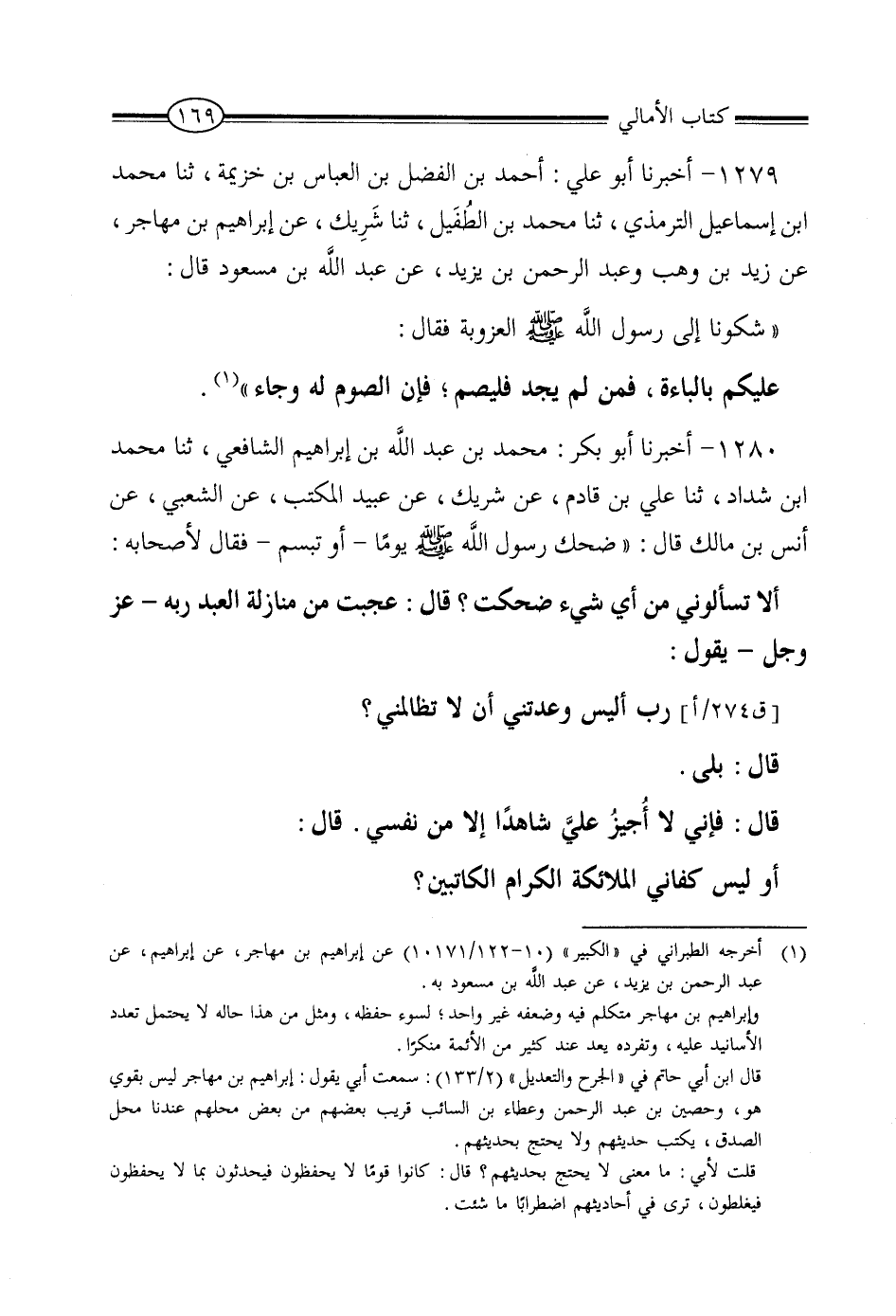 1280 - أَخْبَرَنَا أَبُو بَكْرٍ مُحَمَّدُ بْنُ عَبْدِ اللَّهِ بْنِ إِبْرَاهِيمَ الشَّافِعِيُّ , ثنا مُحَمَّدُ بْنُ شَدَّادٍ , ثنا عَلِيُّ بْنُ قَادِمٍ , عَنْ شَرِيكٍ , عَنْ عُبَيْدٍ الْمُكْتِبِ , عَنِ الشَّعْبِيِّ , عَنْ أَنَسِ بْنِ مَالِكٍ , قَالَ: ضَحِكَ رَسُولُ اللَّهِ صَلَّى اللَّهُ عَلَيْهِ وَسَلَّمَ يَوْمًا أَوْ تَبَسَّمَ فَقَالَ لأَصْحَابِهِ: «أَلا تَسْأَلُونِي مِنْ أَيِّ شَيْءٍ ضَحِكْتُ؟» قَالَ: " عَجِبْتُ مِنْ مُنَازَلَةِ الْعَبْدِ رَبَّهُ عَزَّ وَجَلَّ , يَقُولُ: رَبِّ أَلَيْسَ وَعَدْتَنِي أَنْ لا تَظْلِمَنِي؟ قَالَ: «بَلَى» .