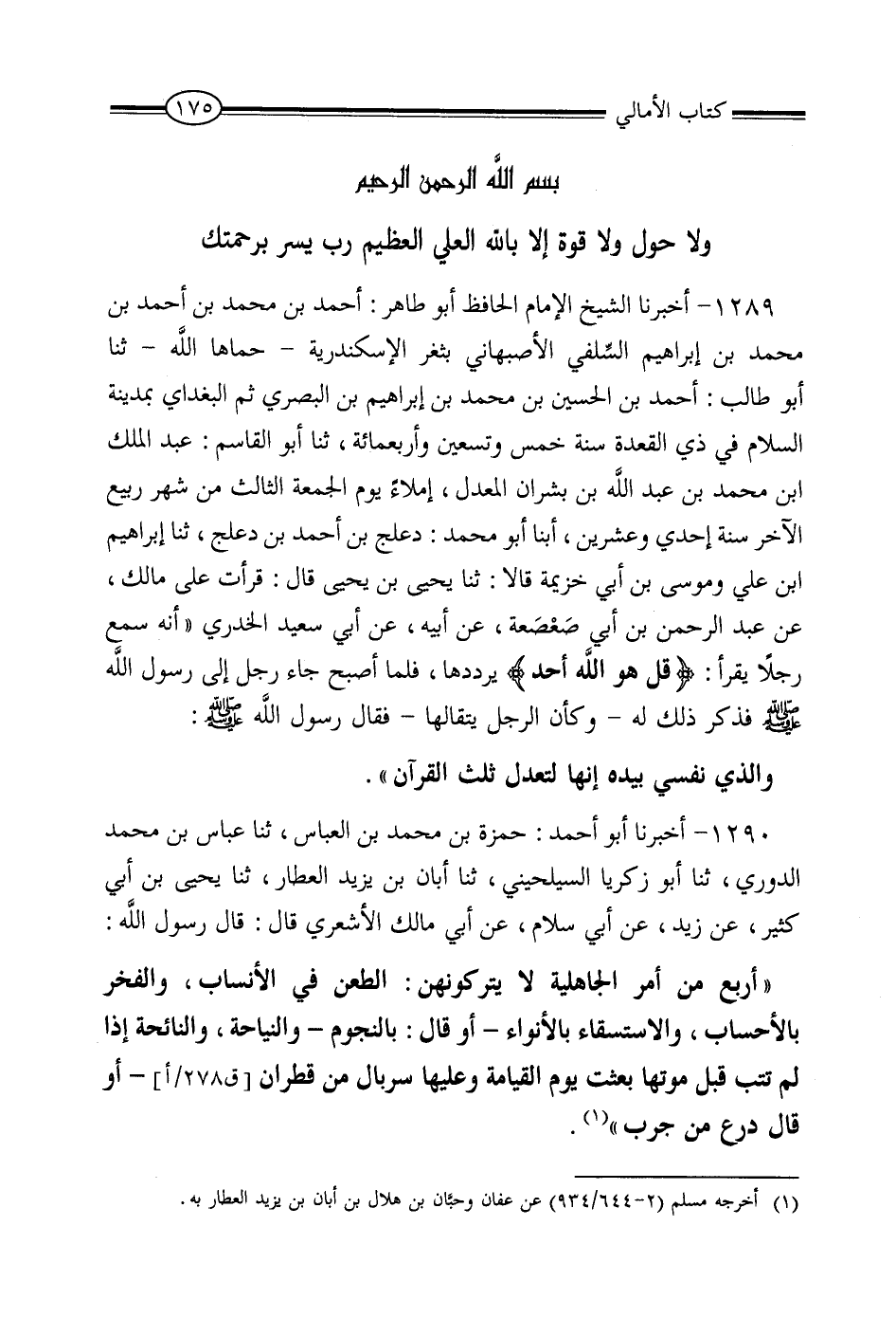 1289 - أَخْبَرَنَا الشَّيْخُ الإِمَامُ الْحَافِظُ أَبُو طَاهِرٍ أَحْمَدُ بْنُ مُحَمَّدِ بْنِ أَحْمَدَ بْنِ مُحَمَّدِ بْنِ إِبْرَاهِيمَ السِّلَفِيُّ الأَصْبَهَانِيُّ، بِثَغْرِ الإِسْكَنْدَرِيَّةِ حَمَاهُ اللَّهُ، أنبا أَبُو طَالِبٍ أَحْمَدُ بْنُ الْحُسَيْنِ بْنِ مُحَمَّدِ بْنِ إِبْرَاهِيمَ بْنِ الْبَصْرِيُّ ثُمَّ الْبَغْدَادِيُّ، بِمَدِينَةِ السَّلامِ، فِي ذِي الْقِعْدَةِ سَنَةَ خَمْسٍ وَتِسْعِينَ وَأَرْبَعِ مِائَةٍ، ثنا أَبُو الْقَاسِمِ عَبْدُ الْمَلِكِ بْنُ مُحَمَّدِ بْنِ عَبْدِ اللَّهِ بْنِ بِشْرَانَ الْمُعَدَّلُ، إِمْلاءً يَوْمَ الْجُمُعَةِ الثَّالِثِ مِنْ شَهْرِ رَبِيعٍ الآخَرِ سَنَةَ إِحْدَى وَعِشْرِينَ، أنبا أَبُو مُحَمَّدٍ دَعْلَجُ بْنُ أَحْمَدَ بْنِ دَعْلَجٍ، ثنا إِبْرَاهِيمُ بْنُ عَلِيٍّ، وَمُوسَى بْنُ أَبِي خُزَيْمَةَ، قَالا: ثنا يَحْيَى بْنُ يَحْيَى، قَالَ: قَرَأْتُ على مَالِكٍ، عَنْ عَبْدِ الرَّحْمَنِ بْنِ أَبِي صَعْصَعَةَ، عَنْ أَبِيهِ، عَنْ أَبِي سَعِيدٍ الْخُدْرِيِّ، أَنَّ رَجُلا سَمِعَ رَجُلا يَقْرَأُ: قُلْ هُوَ اللَّهُ أَحَدٌ يُرَدِّدُهَا، فَلَمَّا أَصْبَحَ جَاءَ إِلَى رَسُولِ اللَّهِ صَلَّى اللَّهُ عَلَيْهِ وَسَلَّمَ، فَذَكَرَ ذَلِكَ لَهُ، وَكَأَنَّ الرَّجُلَ يَتَقَالُّهَا، فَقَالَ رَسُولُ اللَّهِ صَلَّى اللَّهُ عَلَيْهِ وَسَلَّمَ: «وَالَّذِي نَفْسِي بِيَدِهِ، إِنَّهَا لَتَعْدِلُ ثُلُثَ الْقُرْآنِ» .
