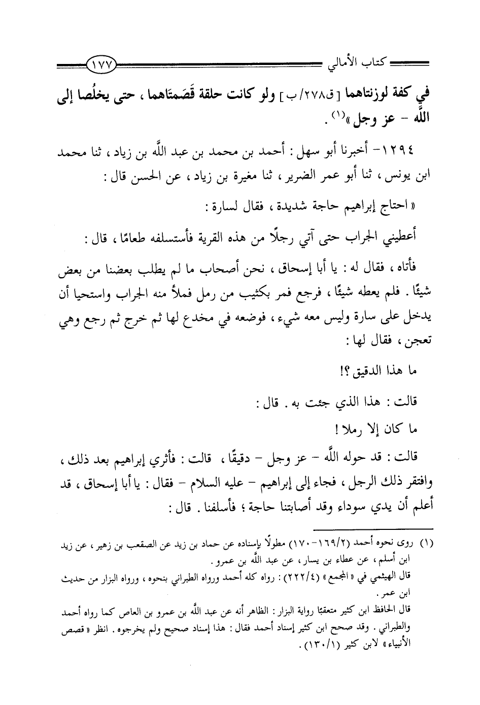1294 - أَخْبَرَنَا أَبُو سَهْلٍ أَحْمَدُ بْنُ مُحَمَّدِ بْنِ عَبْدِ اللَّهِ بْنِ زِيَادٍ، ثنا مُحَمَّدُ بْنُ يُونُسَ، ثنا أَبُو عُمَرَ الضَّرِيرُ، ثنا مُغِيرَةُ بْنُ زَيْدٍ، عَنِ الْحَسَنِ، قَالَ: احْتَاجَ إِبْرَاهِيمُ حَاجَةً شَدِيدَةً، فَقَالَ لِسَارَّةَ: أَعْطِينِي الْجِرَابَ حَتَّى آتِيَ رَجُلا مِنْ هَذِهِ الْقَرْيَةِ فَأَسْتَسْلِفَهُ طَعَامًا.