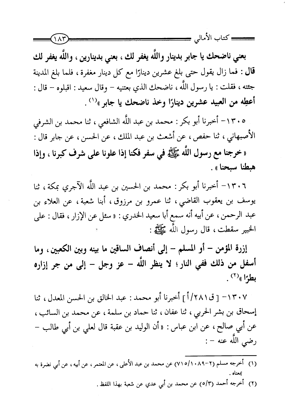 1306 - أَخْبَرَنَا أَبُو بَكْرٍ مُحَمَّدُ بْنُ الْحُسَيْنِ بْنُ عَبْدِ اللَّهِ الآجُرِّيُّ , بِمَكَّةَ، أنبا يُوسُفُ بْنُ يَعْقُوبَ الْقَاضِي، ثنا عَمْرُو بْنُ مَرْزُوقٍ، أنبا شُعْبَةُ، عَنِ الْعَلاءِ بْنِ عَبْدِ الرَّحْمَنِ، عَنْ أَبِيهِ، قَالَ: سَأَلْتُ أَبَا سَعِيدٍ الْخُدْرِيَّ عَنِ الإِزَارِ، فَقَالَ: عَلَى الْخَبِيرِ سَقَطْتَ، قَالَ رَسُولُ اللَّهِ صَلَّى اللَّهُ عَلَيْهِ وَسَلَّمَ: «إِزَارُ الْمُؤْمِنِ أَوِ الْمُسْلِمِ إِلَى أَنْصَافِ السَّاقَيْنِ , مَا بَيْنَهُ وَبَيْنَ الْكَعْبَيْنِ وَمَا أَسْفَلُ مِنْ ذَلِكَ فَفِي النَّارِ، لا يَنْظُرُ اللَّهُ عَزَّ وَجَلَّ إِلَى مَنْ جَرَّ إِزَارَهُ بَطَرًا»