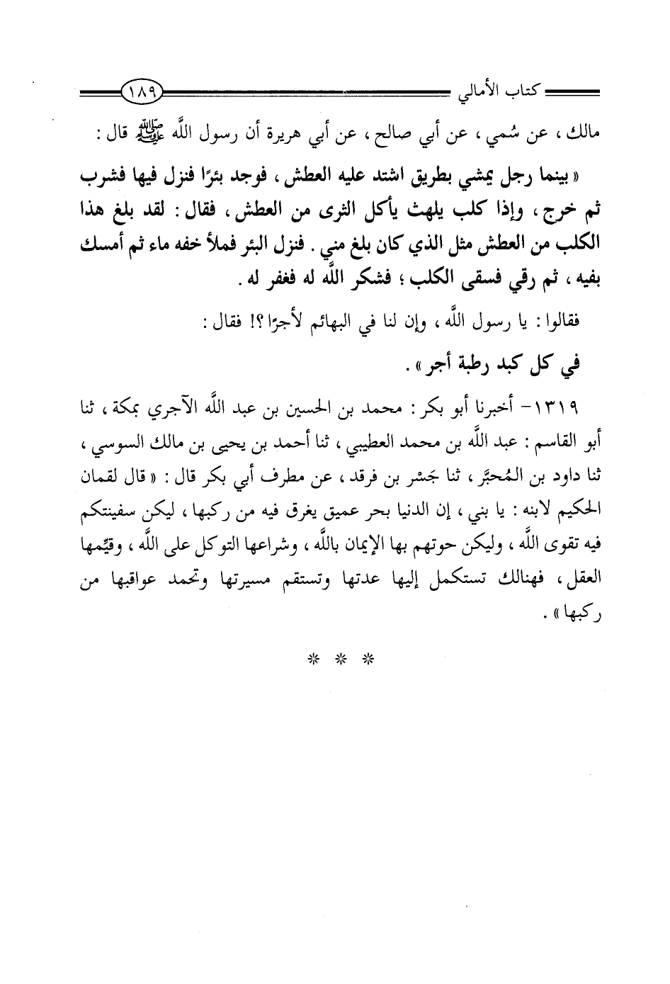 مَالِكٍ، عَنْ سُمَيٍّ، عَنْ أَبِي صَالِحٍ، عَنْ أَبِي هُرَيْرَةَ، أَنّ رَسُولَ اللَّهِ صَلَّى اللَّهُ عَلَيْهِ وَسَلَّمَ , قَالَ: " بَيْنَمَا رَجُلٌ يَمْشِي بِطَرِيقٍ اشْتَدَّ عَلَيْهِ الْعَطَشُ فَوَجَدَ بِئْرًا فَنَزَلَ فِيهَا فَشَرِبَ ثُمَّ خَرَجَ، وَإِذَا كَلْبٌ يَلْهَثُ يَأْكُلُ الثَّرَى مِنَ الْعَطَشِ، فَقَالَ: لَقَدْ بَلَغَ هَذَا الْكَلْبُ مِنَ الْعَطَشِ مِثْلَ الَّذِي كَانَ بَلَغَ مِنِّي، فَنَزَلَ الْبِئْرَ فَمَلأَ خُفَّهُ مَاءً ثُمَّ أَمْسَكَهُ بِفِيهِ ثُمَّ رَقَى فَسَقَى الْكَلْبَ، فَشَكَرَ اللَّهَ لَهُ فَغَفَرَ لَهُ ".