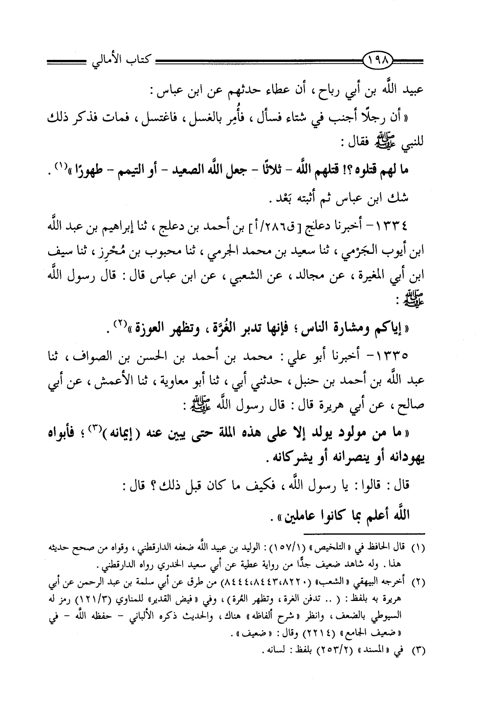 1335 - أَخْبَرَنَا أَبُو عَلِيٍّ مُحَمَّدُ بْنُ أَحْمَدَ بْنِ الْحَسَنِ بْنِ الصَّوَّافِ، ثنا عَبْدُ اللَّهِ بْنُ أَحْمَدَ بْنِ حَنْبَلٍ، حَدَّثَنِي أَبِي، ثنا أَبُو مُعَاوِيَةَ، ثنا الْأَعْمَشُ، عَنْ أَبِي صَالِحٍ، عَنْ أَبِي هُرَيْرَةَ، قَالَ: قَالَ رَسُولُ اللَّهِ صَلَّى اللَّهُ عَلَيْهِ وَسَلَّمَ: «مَا مِنْ مَوْلُودٍ يُولَدُ إِلا عَلَى هَذِهِ الْمِلَّةِ، حَتَّى يَبِينَ عَنْهُ لِسَانُهُ، فَأَبَوَاهُ يُهَوِّدَانِهِ، أَوْ يُنَصِّرَانِهِ، أَوْ يُشَرِّكَانِهِ» ، قَالَ: قَالُوا: يَا رَسُولَ اللَّهِ، فَكَيْفَ مَا كَانُوا قَبْلَ ذَلِكَ؟ قَالَ: «اللَّهُ أَعْلَمُ بِمَا كَانُوا عَامِلِينَ»
