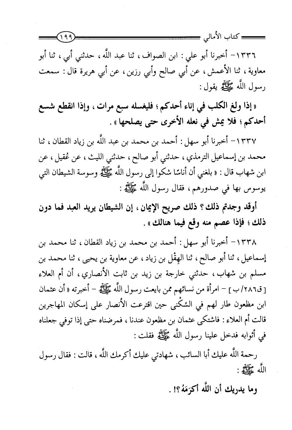 1336 - أَخْبَرَنَا أَبُو عَلِيِّ بْنُ الصَّوَّافِ، ثنا عَبْدُ اللَّهِ، حَدَّثَنِي أَبِي، ثنا أَبُو مُعَاوِيَةَ، ثنا الْأَعْمَشُ، عَنْ أَبِي صَالِحٍ، وَأَبِي رَزِينٍ، عَنْ أَبِي هُرَيْرَةَ، قَالَ: سَمِعْتُ رَسُولَ اللَّهِ صَلَّى اللَّهُ عَلَيْهِ وَسَلَّمَ، يَقُولُ: «إِذَا وَلَغَ الْكَلْبُ فِي إِنَاءِ أَحَدِكُمْ فَلْيَغْسِلْهُ سَبْعَ مَرَّاتٍ، وَإِذَا انْقَطَعَ شِسْعُ أَحَدِكُمْ، فَلا يَمْشِ فِي نَعْلِهِ الأُخْرَى حَتَّى يُصْلِحَهَا»