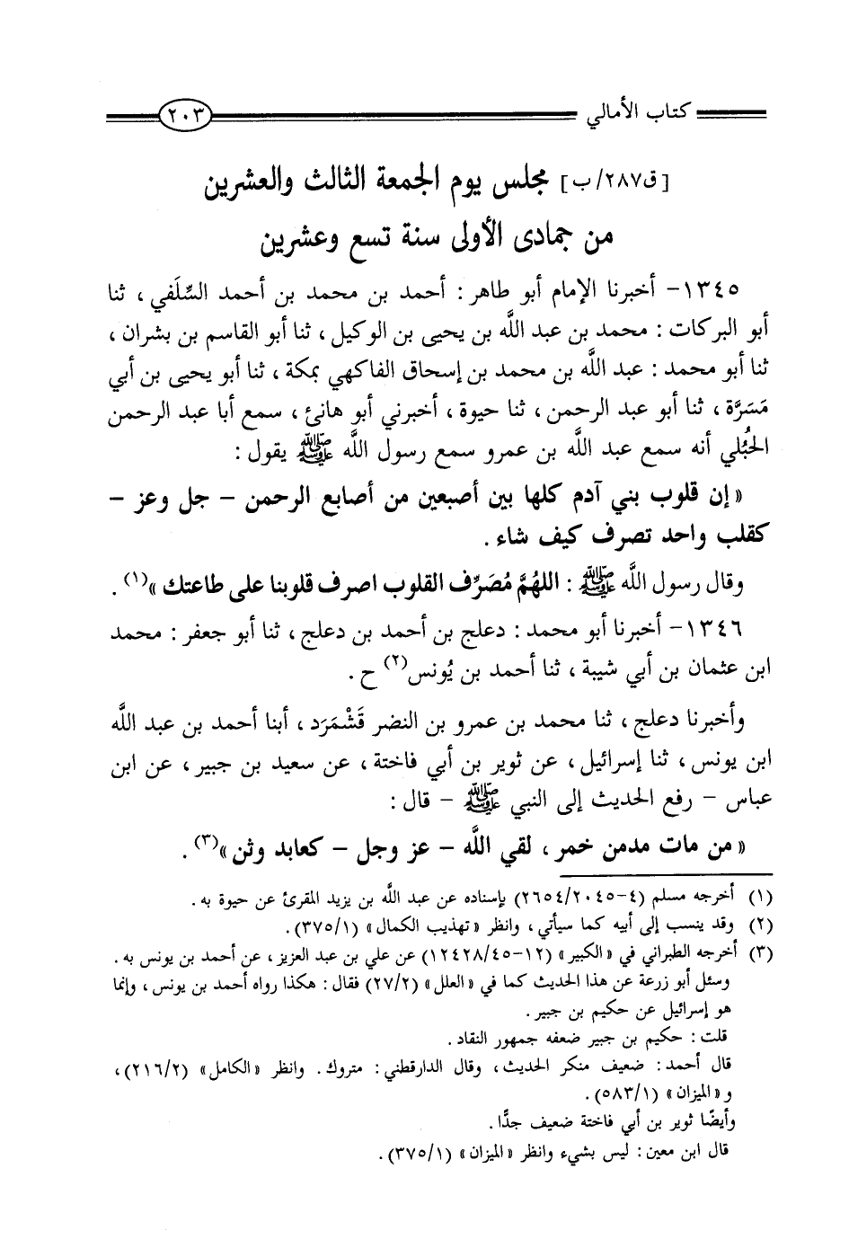 1345 - أَخْبَرَنَا الإِمَامُ أَبُو طَاهِرٍ أَحْمَدُ بْنُ مُحَمَّدِ بْنِ أَحْمَدَ السَّلَفِيُّ، أنبا أَبُو الْبَرَكَاتِ مُحَمَّدُ بْنُ عَبْدِ اللَّهِ بْنِ يَحْيَى بْنِ الْوَكِيل، ثنا أَبُو الْقَاسِمِ بْنُ بِشْرَانَ، ثنا أَبُو مُحَمَّدٍ عَبْدُ اللَّهِ بْنُ مُحَمَّدِ بْنِ إِسْحَاقَ الْفَاكِهِيُّ، بِمَكَّةَ، ثنا أَبُو يَحْيَى بْنُ أَبِي مَسَرَّةَ، ثنا أَبُو عَبْدِ الرَّحْمَنِ، ثنا حَيْوَةُ، أَخْبَرَنِي أَبُو هَانِئٍ، سَمِعَ أَبَا عَبْدِ الرَّحْمَنِ الْحُبُلِيَّ، أَنَّهُ سَمِعَ عَبْدَ اللَّهِ بْنَ عَمْرٍو، سَمِعَ رَسُولَ اللَّهِ صَلَّى اللَّهُ عَلَيْهِ وَسَلَّمَ، يَقُولُ: «إِنَّ قُلُوبَ بَنِي آدَمَ كُلَّهَا بَيْنَ أُصْبُعَيْنِ مِنْ أَصَابِعِ الرَّحْمَنِ جَلَّ وَعَزَّ، كَقَلْبِ وَاحِدٍ يُصَرِّفُ كَيْفَ شَاءَ» ، وَقَالَ رَسُولُ اللَّهِ صَلَّى اللَّهُ عَلَيْهِ وَسَلَّمَ: «اللَّهُمَّ مُصَرِّفَ الْقُلُوبِ اصْرِفْ قُلُوبَنَا إِلَى طَاعَتِكَ»