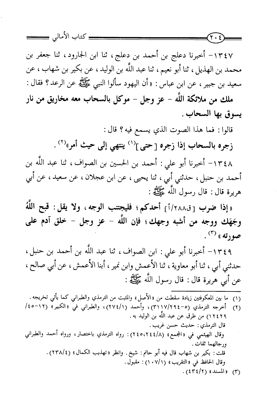 1349 - أَخْبَرَنَا أَبُو عَلِيِّ بْنُ الصَّوَّافِ، ثنا عَبْدُ اللَّهِ بْنُ أَحْمَدَ بْنِ حَنْبَلٍ، حَدَّثَنِي أَبِي، ثنا أَبُو مُعَاوِيَةَ، ثنا الْأَعْمَشُ، وَابْنُ نُمَيْرٍ، أنبا الأعمش، عَنْ أَبِي صَالِحٍ، عَنْ أَبِي هُرَيْرَةَ، قَالَ: قَالَ رَسُولُ اللَّهِ صَلَّى اللَّهُ عَلَيْهِ وَسَلَّمَ: