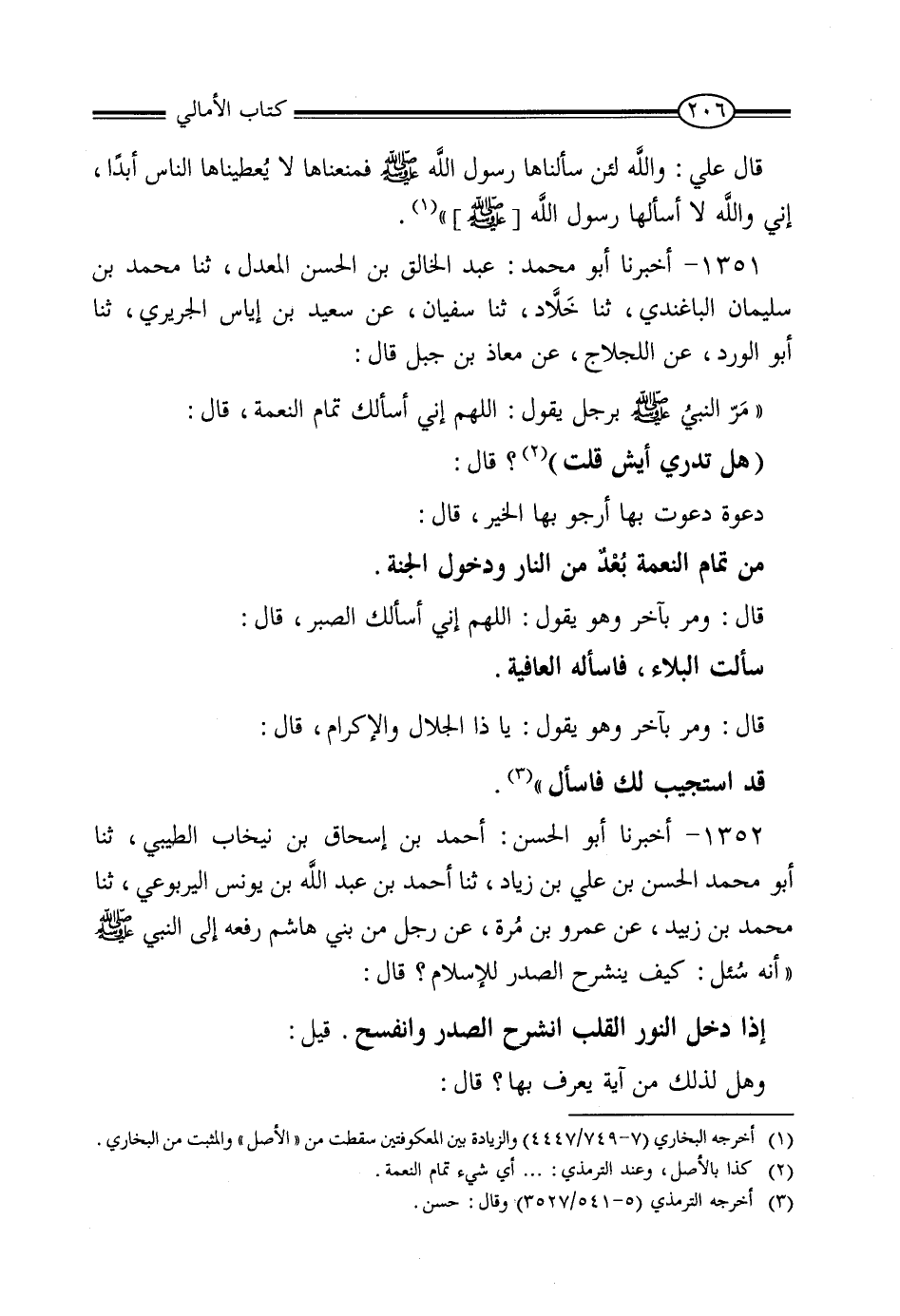 1351 - أَخْبَرَنَا أَبُو مُحَمَّدٍ عَبْدُ الْخَالِقِ بْنُ الْحَسَنِ الْمُعَدِّلُ، ثنا مُحَمَّدُ بْنُ سُلَيْمَانَ الْبَاغَنْدِيُّ، ثنا خَلادٌ، ثنا سُفْيَانُ، عَنْ سَعِيدِ بْنِ إِيَاسٍ الْجَرِيرِيِّ، ثنا أَبُو الْوَرْدِ، عَنِ اللَّجْلاجِ، عَنْ مُعَاذِ بْنِ جَبَلٍ، قَالَ: مَرَّ النَّبِيُّ صَلَّى اللَّهُ عَلَيْهِ وَسَلَّمَ بِرَجُلٍ يَقُولُ: اللَّهُمَّ إِنِّي أَسْأَلُكَ تَمَامَ النِّعْمَةِ.