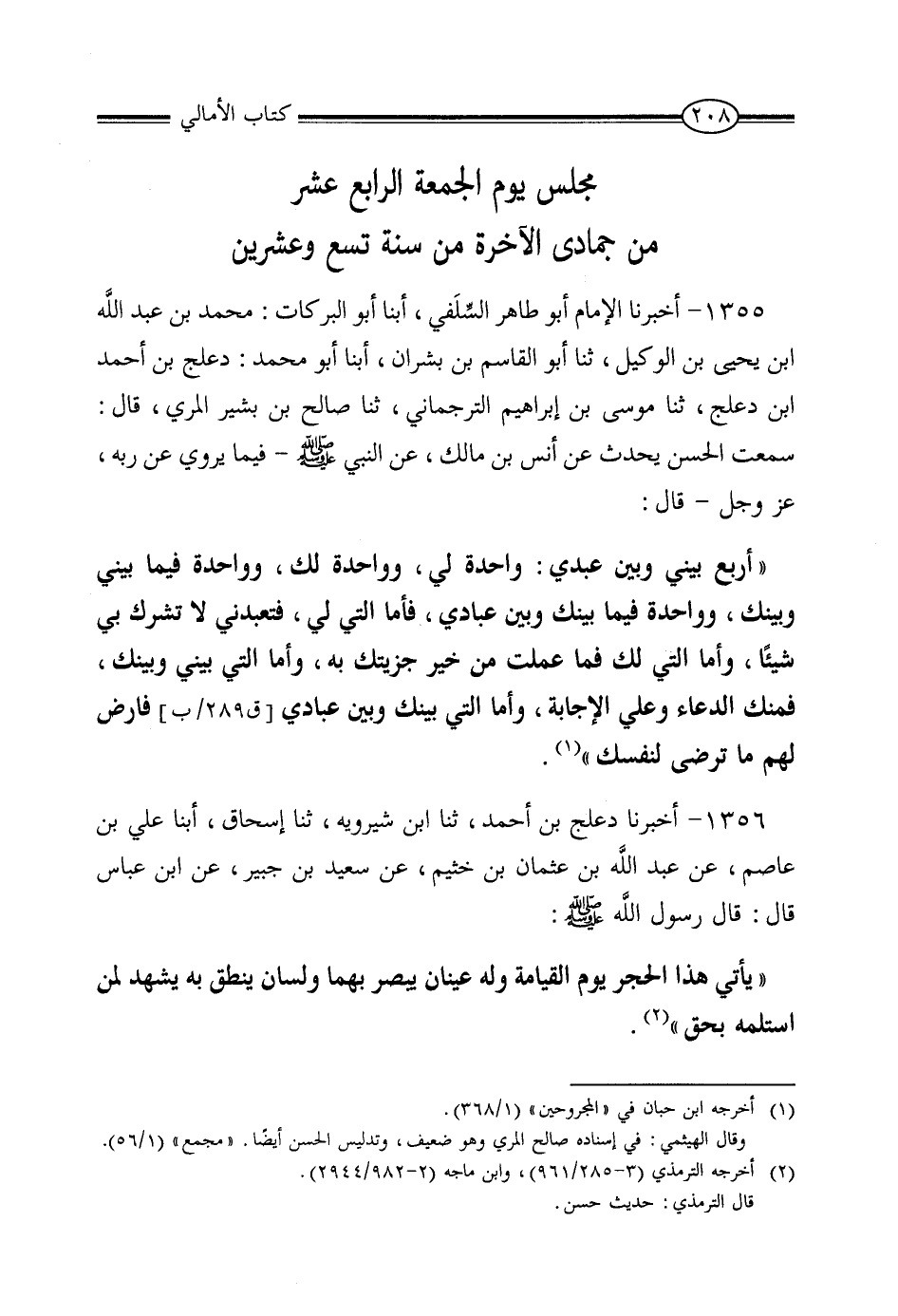 1355 - أَخْبَرَنَا الْإِمَامُ أَبُو طَاهِرٍ السَّلَفِيُّ، أنا أَبُو الْبَرَكَاتِ مُحَمَّدُ بْنُ عَبْدِ اللَّهِ بْنِ يَحْيَى بْنِ الْوَكِيلِ، نا أَبُو الْقَاسِمِ بْنُ بِشْرَانَ، أنبا أَبُو مُحَمَّدٍ دَعْلَجُ بْنُ أَحْمَدَ بْنِ دَعْلَجٍ، ثنا مُوسَى بْنُ هَارُونَ، حَدَّثَنِي أَبُو إِبْرَاهِيم التُّرْجُمَانِيُّ، ثنا صَالِحُ بْنُ بَشِيرٍ الْمُرِّيُّ، قَالَ: سَمِعْتُ الْحَسَنَ , يُحَدِّثُ عَنْ أَنَسِ بْنِ مَالِكٍ، عَنِ النَّبِيِّ صَلَّى اللَّهُ عَلَيْهِ وَسَلَّمَ، فِيمَا يُرْوَى عَنْ رَبِّهِ عَزَّ وَجَلَّ , قَالَ: «أَرْبَعٌ بَيْنِي وَبَيْنَ عَبْدِي، وَاحِدَةٌ لِي، وَوَاحِدَةٌ لَكَ، وَوَاحِدَةٌ فِيمَا بَيْنِي وَبَيْنَكَ، وَوَاحِدَةٌ فِيمَا بَيْنَكَ وَبَيْنَ عِبَادِي، فَأَمَّا الَّتِي لِي، فَتَعْبُدُنِي لا تُشْرِكُ بِي شَيْئًا، وَأَمَّا الَّتِي لَكَ فَمَا عَمِلْتَ مِنْ خَيْرٍ جَزَيْتُكَ بِهِ، وَأَمَّا الَّتِي بَيْنِي وَبَيْنَكَ، فَمِنْكَ الدُّعَاءُ وَعَلَيَّ الإِجَابَةُ، وَأَمَّا الَّتِي بَيْنَكَ وَبَيْنَ عِبَادِي، فَارْضَ لَهُمْ مَا تَرْضَى لِنَفْسِكَ»