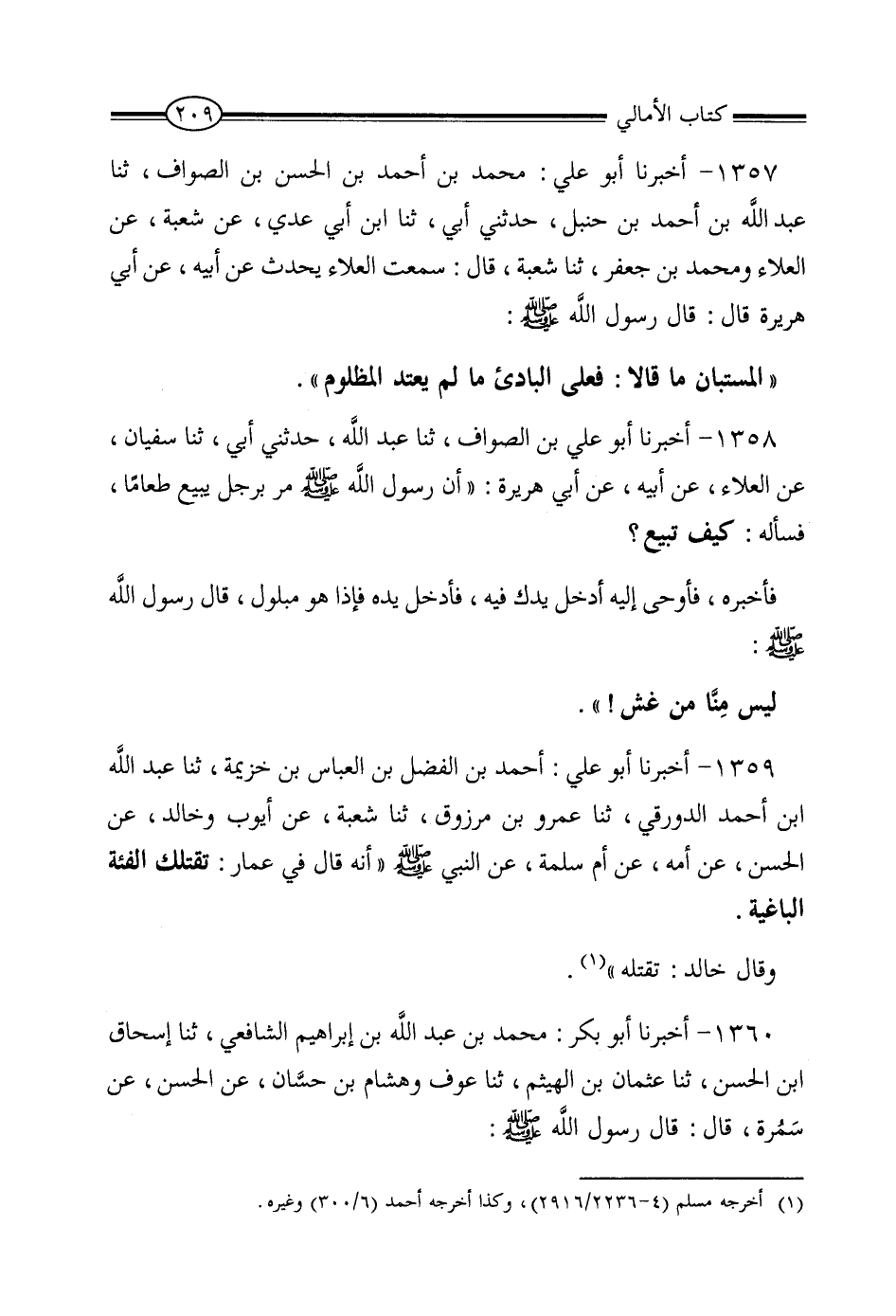 1357 - أَخْبَرَنَا أَبُو عَلِيٍّ مُحَمَّدُ بْنُ أَحْمَدَ بْنِ الْحَسَنِ بْنِ الصَّوَّافِ، ثنا عَبْدُ اللَّهِ بْنُ أَحْمَدَ بْنِ حَنْبَلٍ، حَدَّثَنِي أَبِي , ثنا ابْنُ أَبِي عَدِيٍّ، عَنْ شُعْبَةَ، عَنِ الْعَلاءِ وَمُحَمَّدُ بْنُ جَعْفَرٍ، ثنا شُعْبَةُ , قَالَ: سَمِعْتُ الْعَلاءَ، يُحَدِّثُ عَنْ أَبِيهِ، عَنْ أَبِي هُرَيْرَةَ، قَالَ: قَالَ رَسُولُ اللَّهِ صَلَّى اللَّهُ عَلَيْهِ وَسَلَّمَ: «الْمُسْتَبَانُ مَا قَالا فَعَلَى الْبَادِئِ مَا لَمْ يَعْتَدِ الْمَظْلُومُ»