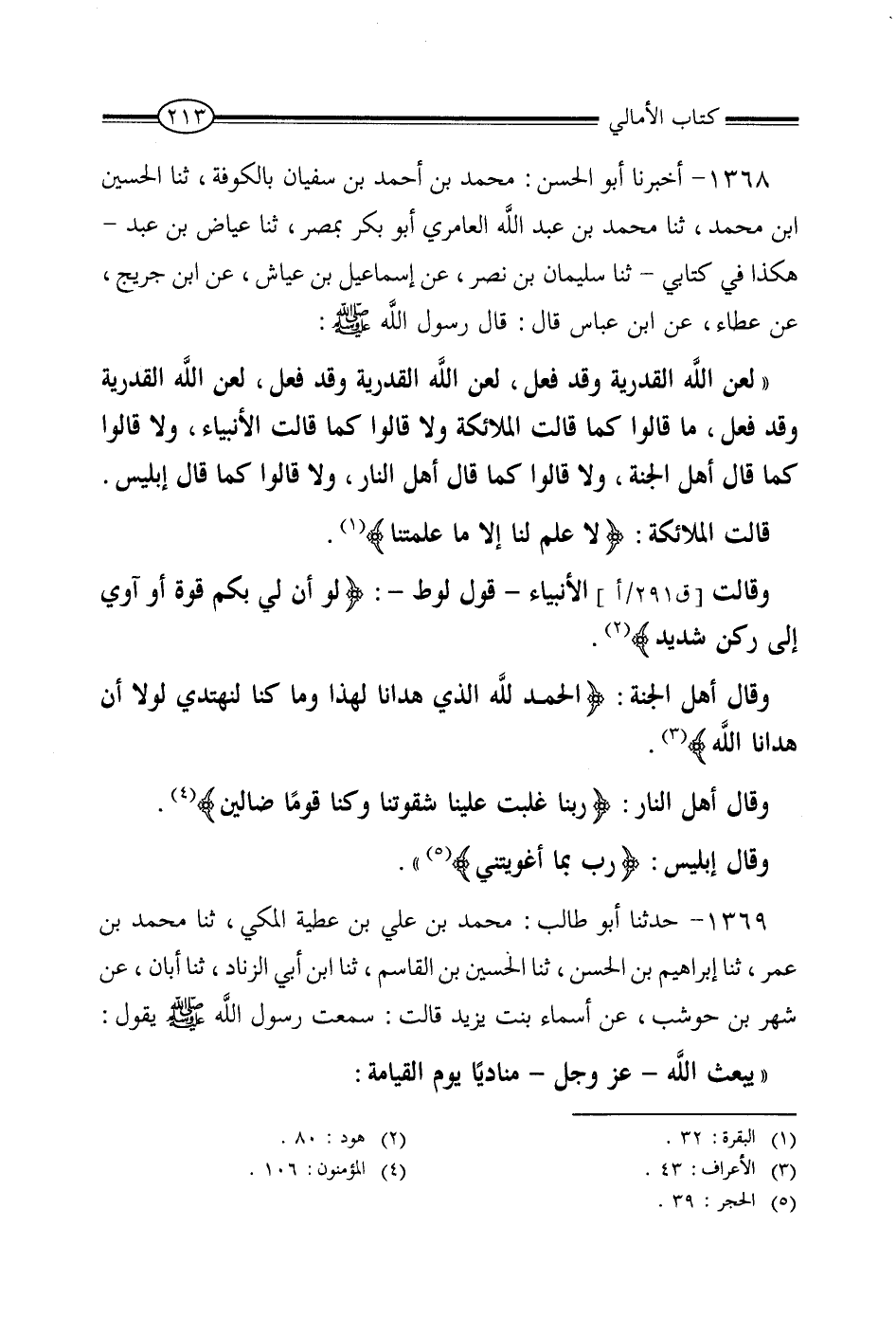 1368 - أَخْبَرَنَا أَبُو الْحَسَنِ مُحَمَّدُ بْنُ أَحْمَدَ بْنِ سُفْيَانَ بِالْكُوفَةِ، ثنا الْحُسَيْنُ بْنُ مُحَمَّدٍ، ثنا مُحَمَّدُ بْنُ عَبْدِ اللَّهِ الْعَامِرِيُّ أَبُو بَكْرٍ , بِمِصْرَ، ثنا عِيَاضُ بْنُ عَبْدٍ هَكَذَا فِي كِتَابِي ثنا سُلَيْمَانُ بْنُ نَصْرٍ، عَنْ إِسْمَاعِيلَ بْنِ عَيَّاشٍ، عَنِ ابْنِ جُرَيْجٍ، عَنْ عَطَاءٍ، عَنِ ابْنِ عَبَّاسٍ، قَالَ: قَالَ رَسُولُ اللَّهِ صَلَّى اللَّهُ عَلَيْهِ وَسَلَّمَ: " لَعَنَ اللَّهُ الْقَدَرِيَّةَ وَقَدْ فَعَلَ , لَعَنَ اللَّهُ الْقَدَرِيَّةَ وَقَدْ فَعَلَ، لَعَنَ اللَّهُ الْقَدَرِيَّةَ وَقَدْ فَعَلَ، مَا قَالُوا كَمَا قَالَتِ الْمَلائِكَةُ، وَلا قَالُوا كَمَا قَالَتِ الأَنْبِيَاءُ، وَلا قَالُوا كَمَا قَالَ أَهْلُ الْجَنَّةِ، وَلا قَالُوا كَمَا قَالَ أَهْلُ النَّارِ، وَلا قَالُوا كَمَا قَالَ إِبْلِيسُ، قَالَتِ الْمَلائِكَةُ: {لا عِلْمَ لَنَا إِلا مَا عَلَّمْتَنَا} [البقرة: 32] , وَقَالَتِ الأَنْبِيَاءُ قَوْلَ لُوطٍ: {لَوْ أَنَّ لِي بِكُمْ قُوَّةً أَوْ آوِي إِلَى رُكْنٍ شَدِيدٍ} [هود: 80] ، وَقَالَ أَهْلُ الْجَنَّةِ: {الْحَمْدُ لِلَّهِ الَّذِي هَدَانَا لِهَذَا وَمَا كُنَّا لِنَهْتَدِيَ لَوْلا أَنْ هَدَانَا اللَّهُ} [الأعراف: 43] ، وَقَالَ أَهْلُ النَّارِ: {رَبَّنَا غَلَبَتْ عَلَيْنَا شِقْوَتُنَا وَكُنَّا قَوْمًا ضَالِّينَ} [المؤمنون: 106] ، وَقَالَ إِبْلِيسُ: {رَبِّ بِمَا أَغْوَيْتَنِي} [الحجر: 39] "