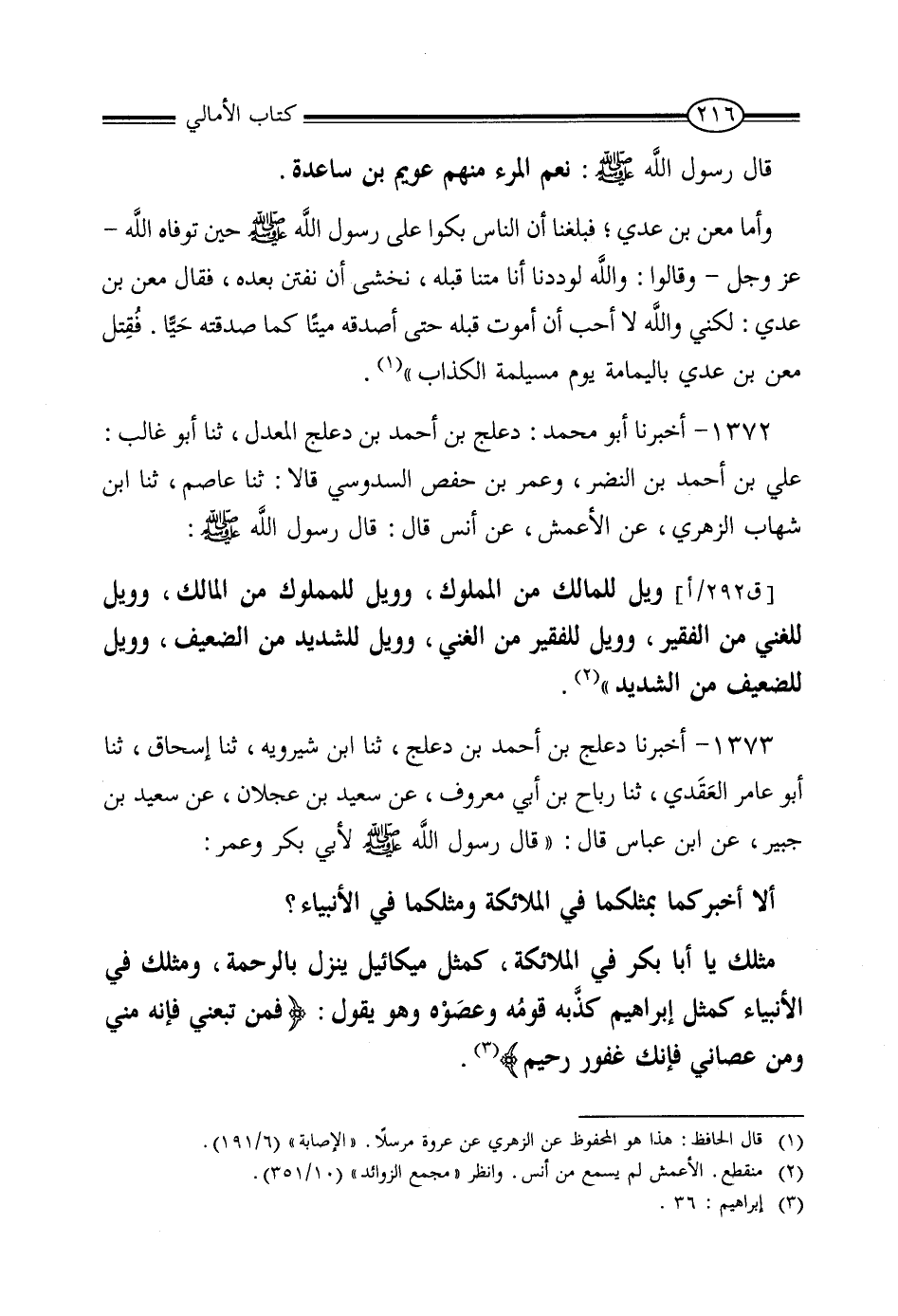 1373 - أَخْبَرَنَا دَعْلَجُ بْنُ أَحْمَدَ بْنِ دَعْلَجٍ، ثنا ابْنُ شِيرَوَيْهِ، ثنا إِسْحَاقُ، أنبا أَبُو عَامِرٍ الْعَقَدِيُّ، ثنا رَبَاحُ بْنُ أَبِي مَعْرُوفٍ، عَنْ سَعِيدِ بْنِ عَجْلانَ، عَنْ سَعِيدِ بْنِ جُبَيْرٍ، عَنِ ابْنِ عَبَّاسٍ، قَالَ: قَالَ رَسُولُ اللَّهِ صَلَّى اللَّهُ عَلَيْهِ وَسَلَّمَ لأَبِي بَكْرٍ وَعُمَرَ: " أَلا أُخْبِرُكُمَا بِمَثَلِكُمَا فِي الْمَلائِكَةِ، وَمَثَلِكُمَا فِي الأَنْبِيَاءِ؟ مَثَلُكَ يَا أَبَا بَكْرٍ فِي الْمَلائِكَةِ، كَمَثَلِ مِيكَائِيلَ يَنْزِلُ بِالرَّحْمَةِ، وَمَثَلُكَ فِي الأَنْبِيَاءِ كَمَثَلِ إِبْرَاهِيمَ، كَذَّبَهُ قَوْمُهُ وَعَصَوْهُ، وَهُوَ يَقُولُ: {فَمَنْ تَبِعَنِي فَإِنَّهُ مِنِّي وَمَنْ عَصَانِي فَإِنَّكَ غَفُورٌ رَحِيمٌ} [إبراهيم: 36] .