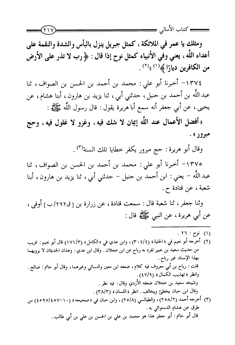 1374 - أَخْبَرَنَا أَبُو عَلِيٍّ مُحَمدُ بْنُ أَحْمَدَ بْنِ الْحَسَنِ بْنِ الصَّوَّافِ، ثنا عَبْدُ اللَّهِ بْنُ أَحْمَدَ بْنِ حَنْبَلٍ، حَدَّثَنِي أَبِي، ثنا يَزِيدُ بْنُ هَارُونَ، أنبا هِشَامٌ، عَنْ يَحْيَى، عَنْ أَبِي جَعْفَرٍ , أَنَّهُ سَمِعَ أَبَا هُرَيْرَةَ، يَقُولُ: قَالَ رَسُولُ اللَّهِ صَلَّى اللَّهُ عَلَيْهِ وَسَلَّمَ: «أَفْضَلُ الأَعْمَالِ عِنْدَ اللَّهِ عَزَّ وَجَلَّ، إِيمَانٌ لا شَكَّ فِيهِ، وَغَزْوٌ لا غُلُولَ فِيهِ، وَحَجٌّ مَبْرُورٌ» .