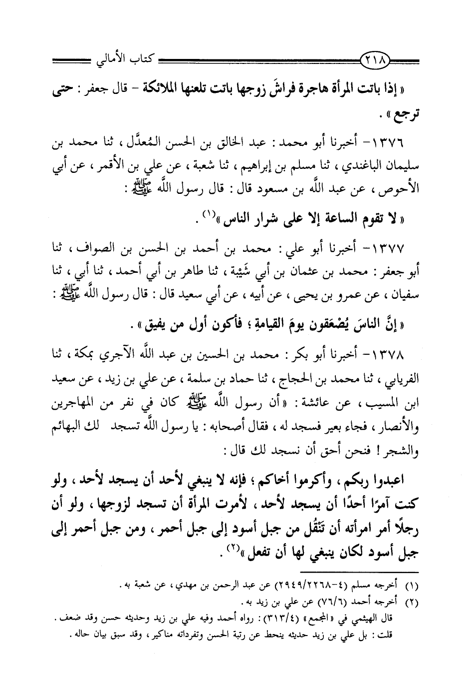 قَالَ: «اعْبُدُوا رَبَّكُمْ وَأَكْرِمُوا أَخَاكُمْ، فَإِنَّهُ لا يَنْبَغِي لأَحَدٍ أَنْ يَسْجُدَ لأَحَدٍ، وَلَوْ كُنْتُ آمِرًا أَحَدًا أَنْ يَسْجُدَ لأَحَدٍ، لأَمَرْتُ الْمَرْأَةَ أَنْ تَسْجُدَ لِزَوْجِهَا، وَلَوْ أَنَّ رَجُلًا أَمَرَ امْرَأَتَهُ أَنْ تُنْقَلَ مِنْ جَبَلٍ أَسْوَدَ إِلَى جَبَلٍ أَحْمَرَ، وَمِنْ جَبَلٍ أَحْمَرَ إِلَى جَبَلٍ أَسْوَدَ، لَكَانَ نَوْلَهَا أَنْ تَفْعَلَ»