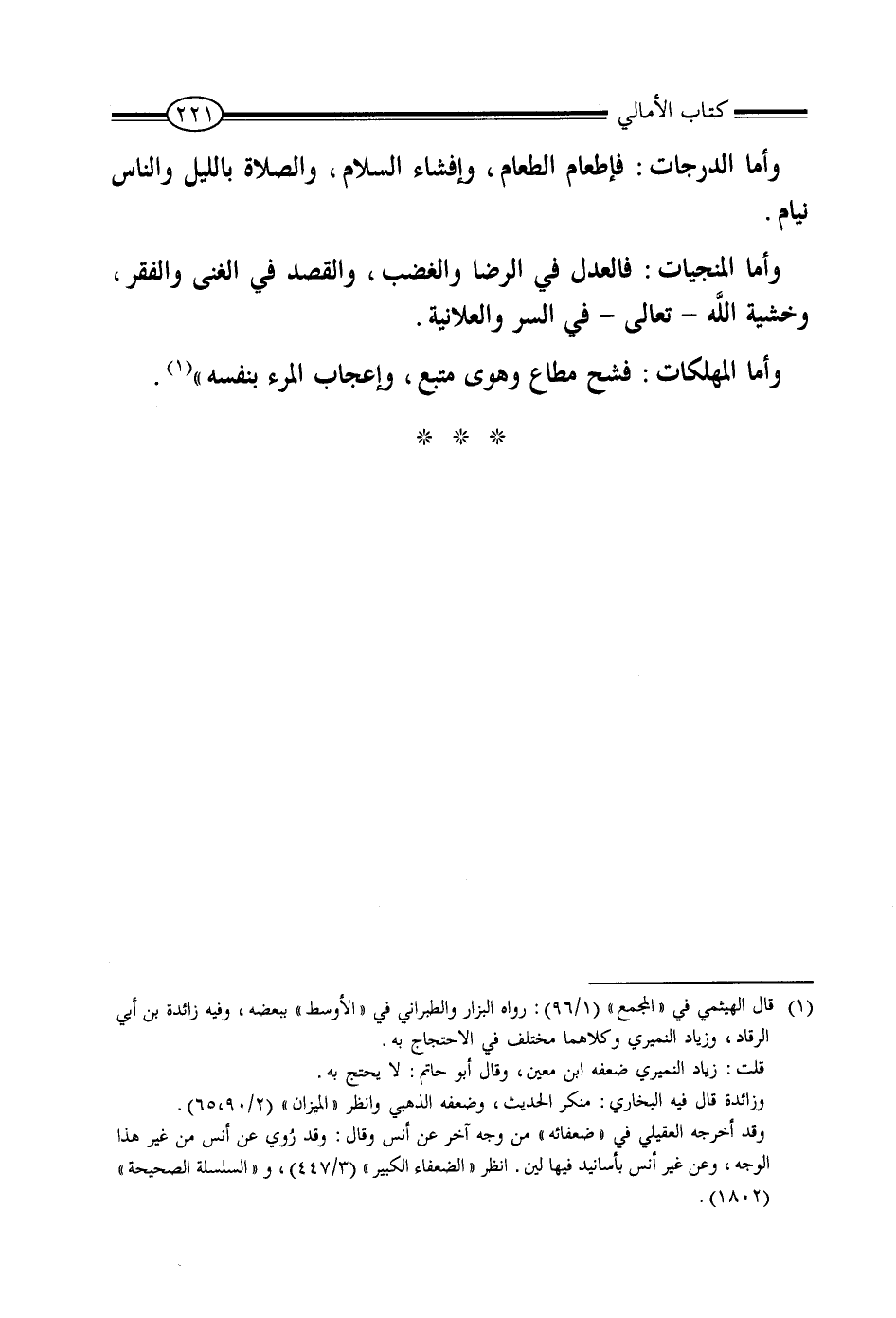 وَأَمَّا الدَّرَجَاتُ فَإِطْعَامُ الطَّعَامِ، وَإِفْشَاءُ السَّلامِ، وَالصَّلاةُ بِاللَّيْلِ وَالنَّاسُ نِيَامٌ، وَأَمَّا الْمُنَجِيَاتُ: فَالْعَدْلُ فِي الرِّضَا وَالْغَضَبِ، وَالْقَصْدُ فِي الْغِنَى وَالْفَقْرِ، وَخَشْيَةُ اللَّهِ تَعَالَى فِي السِّرِّ وَالْعَلانِيَةِ، وَأَمَّا الْمُهْلِكَاتُ: فَشُحٌّ مُطَاعٌ، وَهَوًى مُتَّبَعٌ، وَإِعْجَابُ الْمَرْءِ بِنَفْسِهِ "