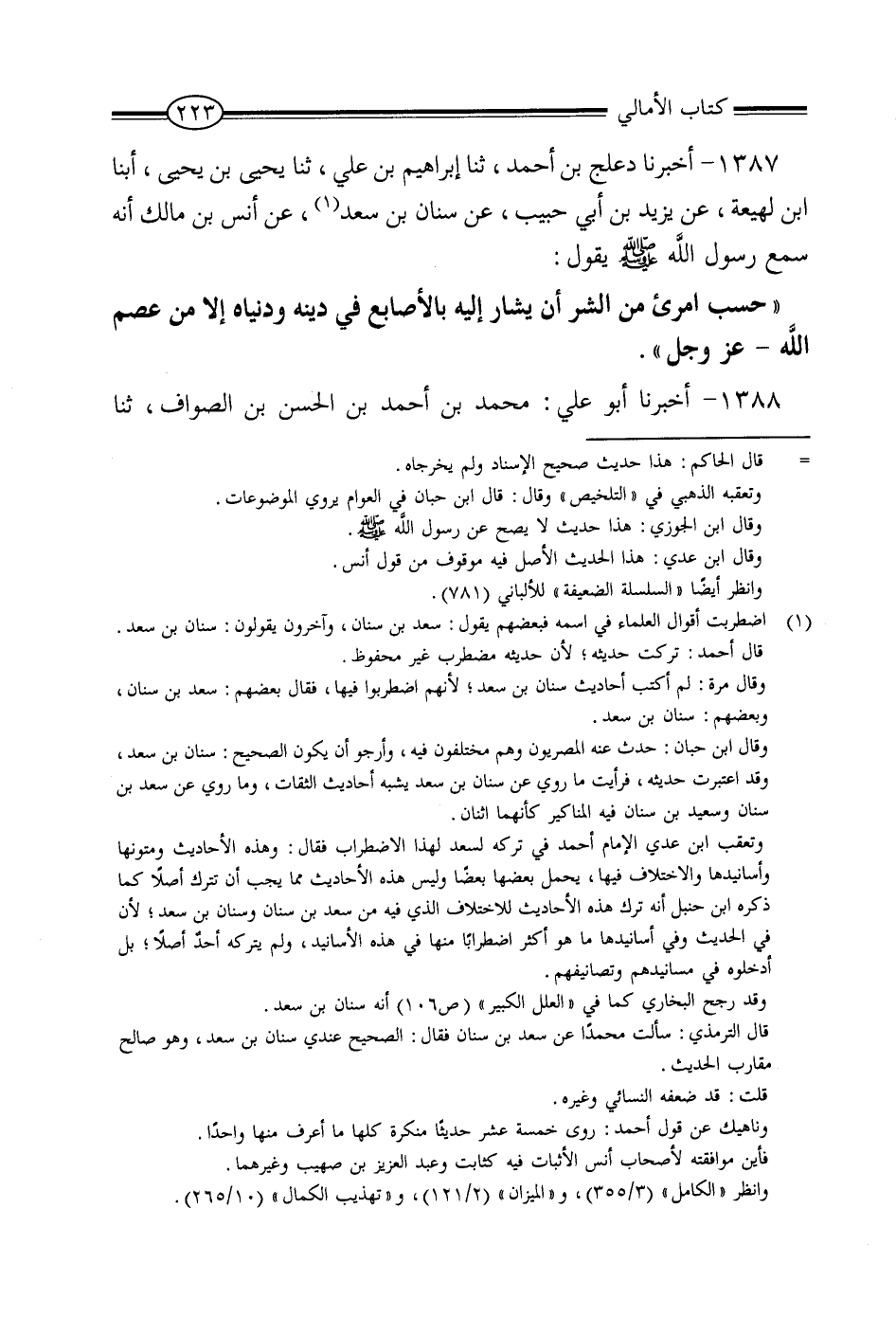1387 - أَخْبَرَنَا دَعْلَجُ بْنُ أَحْمَدَ، ثنا إِبْرَاهِيمُ بْنُ عَلِيٍّ، ثنا يَحْيَى بْنُ يَحْيَى، أنبا أَبُو لَهِيعَةَ، عَنْ يَزِيدَ بْنِ أَبِي حَبِيبٍ، عَنْ سِنَانِ بْنِ سَعْدٍ، عَنْ أَنَسِ بْنِ مَالِكٍ، أَنَّهُ سَمِعَ رَسُولَ اللَّهِ صَلَّى اللَّهُ عَلَيْهِ وَسَلَّمَ، يَقُولُ: «حَسْبُ امْرِئٍ مِنَ الشَّرِّ أَنْ يُشَارَ إِلَيْهِ بِالأَصَابِعِ فِي دِينِهِ وَدُنْيَاهُ، إِلا مَنْ عَصَمَ اللَّهُ عَزَّ وَجَلَّ»