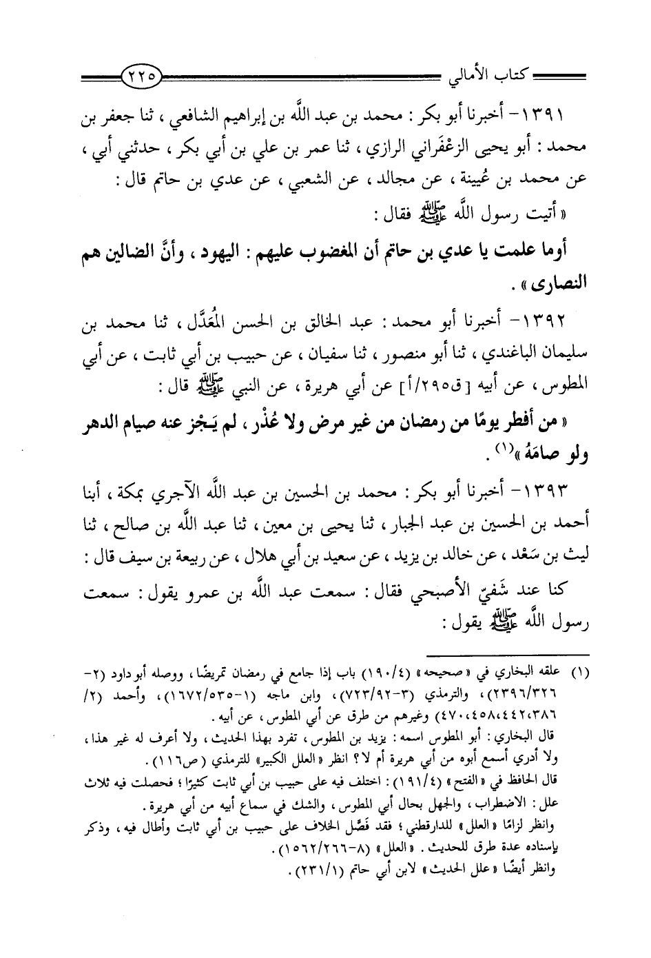 1391 - أَخْبَرَنَا أَبُو بَكْرٍ مُحَمَّدُ بْنُ عَبْدِ اللَّهِ بْنِ إِبْرَاهِيمَ الشَّافِعِيُّ، ثنا جَعْفَرُ بْنُ مُحَمَّدٍ أَبُو يَحْيَى الزَّعْفَرَانِيُّ الرَّازِيُّ، ثنا عُمَرُ بْنُ عَلِيِّ بْنِ أَبِي بَكْرٍ، حَدَّثَنِي أَبِي، عَنْ مُحَمَّدِ بْنِ عُيَيْنَةَ، عَنْ مُجَالِدٍ، عَنِ الشَّعْبِيِّ، عَنْ عَدِيِّ بْنِ حَاتِمٍ، قَالَ: أَتَيْتُ رَسُولَ اللَّهِ صَلَّى اللَّهُ عَلَيْهِ وَسَلَّمَ، فَقَالَ: «أَوَ مَا عَلِمْتَ يَا عَدِيُّ بْنَ حَاتِمٍ أَنَّ الْمَغْضُوبَ عَلَيْهِمْ الْيَهُودُ , وَأَنَّ الضَّالِّينَ هُمُ النَّصَارَى»