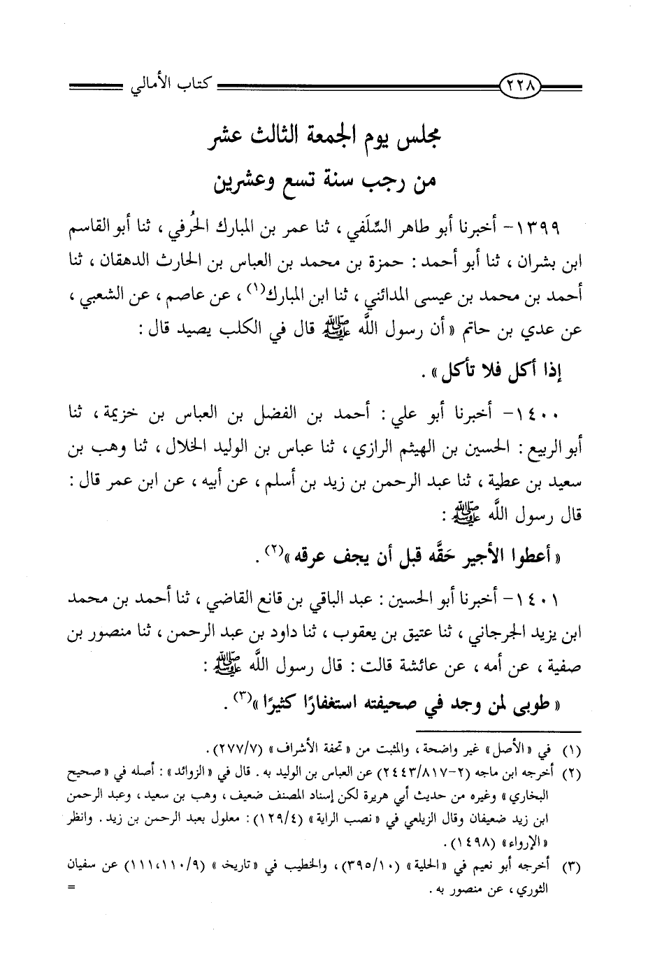 1399 - أَخْبَرَنَا السَّلَفِي، أنبا أَبُو الْفَوَارِسِ عُمَرُ بْنُ الْمُبَارَكِ الْخَرَقِيّ، ثنا أَبُو الْقَاسِمِ بْنُ بِشْرَانَ، أنبا أَبُو أَحْمَدَ حَمْزَةُ بْنُ مُحَمَّدِ بْنِ الْعَبَّاسِ بْنِ الْحَارِثِ الدِّهْقَانُ، ثنا أَحْمَدُ بْنُ مُحَمَّدِ بْنِ عِيسَى الْبِرْتِيُّ، ثنا أَبُو سَلَمَةَ، ثنا حَمَّادٌ، عَنْ عَاصِمٍ، عَنِ الشَّعْبِيِّ، عَنْ عَدِيِّ بْنِ حَاتِمٍ، أَنّ رَسُولَ اللَّهِ صَلَّى اللَّهُ عَلَيْهِ وَسَلَّمَ، قَالَ: «فِي الْكَلْبِ يَصِيدُ» .
