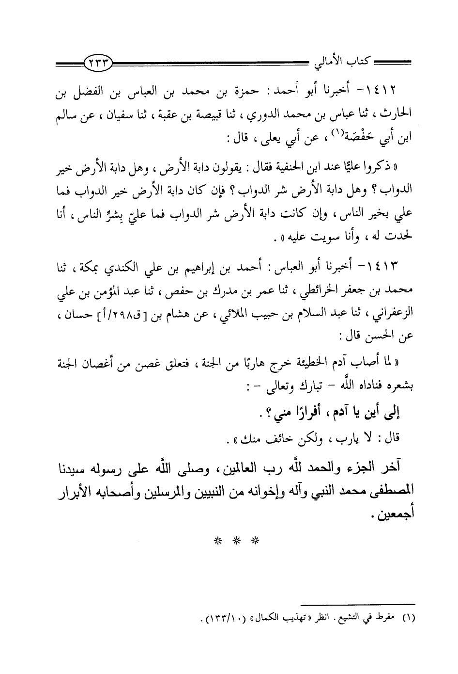 1413 - أَخْبَرَنَا أَبُو الْعَبَّاسِ أَحْمَدُ بْنُ إِبْرَاهِيمَ بْنِ عَلِيٍّ الْكِنْدِيُّ , بِمَكَّةَ، ثنا مُحَمَّدُ بْنُ جَعْفَرٍ الْخَرَائِطِيُّ، ثنا ابْنُ عُمَرَ بْنُ مُدْرَكٍ أَبُو حَفْصٍ، ثنا عَبْدُ الْمُؤْمِنِ بْنُ عَلِيٍّ الزَّعْفَرَانِيُّ , ثنا عَبْدُ السَّلامِ بْنُ حَرْبٍ الْمُلائِيُّ، عَنْ هِشَامِ بْنِ حَسَّانٍ، عَنِ الْحَسَنِ، قَالَ: لَمَّا أَصَابَ آدَمُ الْخَطِيئَةَ خَرَجَ هَارِبًا مِنَ الْجَنَّةِ , فَتَعَلَّقَ غُصْنٌ مِنْ أَغْصَانِ الْجَنَّةِ بِشِعْرِهِ , فَنَادَاهُ اللَّهُ تَبَارَكَ وَتَعَالَى «إِلَى أَيْنَ يَا آدَمُ أَفِرَارًا مِنِّي؟» قَالَ: لا يَا رَبِّ وَلَكِنْ حَيَاءً مِنْكَ