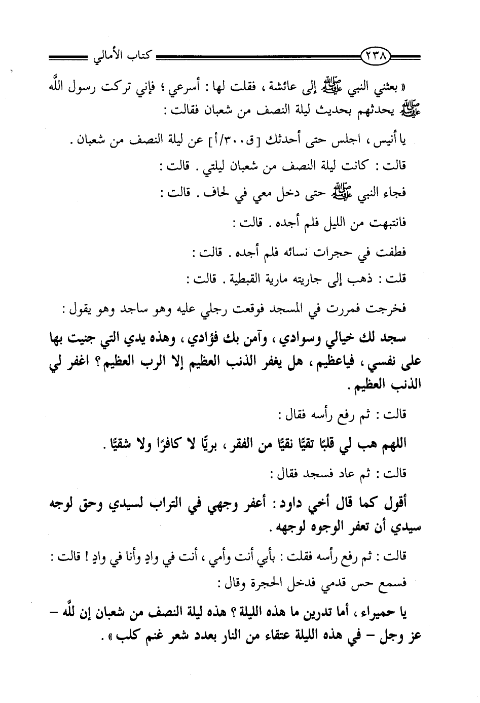 قَالَتْ: فَسَمِعَ حِسَّ قَدَمِي فَدَخَلَ الْحُجْرَةَ وَقَالَ: «يَا حُمَيْرَاءُ أَمَا تَدْرِينَ مَا هَذِهِ اللَّيْلَةُ، هَذِهِ لَيْلَةُ النِّصْفِ مِنْ شَعْبَانَ , إِنَّ لِلَّهِ عَزَّ وَجَلَّ فِي هَذِهِ اللَّيْلَةِ عُتَقَاءَ مِنَ النَّارِ بِعَدَدِ شَعْرِ غَنَمِ كَلْبٍ» .